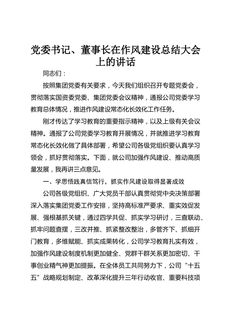 黨委書記、董事長在作風建設(shè)總結(jié)大會上的講話同志們:按照集團黨委有關(guān)要求,今天我們組織召開專題黨委會,貫徹落實國資委黨委、集團黨委會議精神,通報公司黨委學(xué)習(xí)教育總體情況,推進作風建設(shè)常態(tài)化長效化工作任務(wù)。剛才傳達了學(xué)習(xí)教育的重要指示精神,以及上級有關(guān)會議精神。通報了公司黨委學(xué)習(xí)教育開展情況,并就推進學(xué)習(xí)教育常態(tài)化長效化做了具體部署,希望公司各級黨組織要認真學(xué)習(xí)領(lǐng)會,抓好貫徹落實。下面,就公司加強作風建設(shè)、推動高質(zhì)量發(fā)展,我再講三點意見。一、學(xué)思悟踐真信篤行,抓實作風建設(shè)取得顯著成效公司各級黨組織、廣大黨員干部認真貫徹黨中央決策...