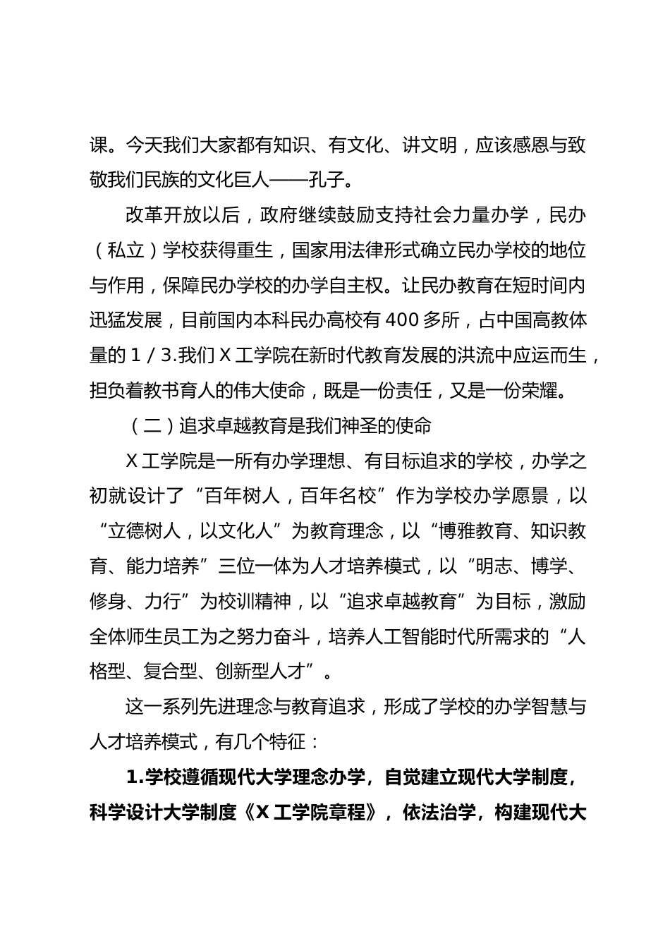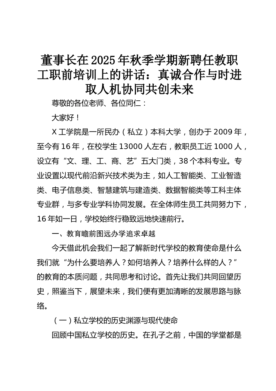 董事長在2025年秋季學(xué)期新聘任教職工職前培訓(xùn)上的講話:真誠合作與時(shí)進(jìn)取人機(jī)協(xié)同共創(chuàng)未來尊敬的各位老師、各位同仁:大家好!X工學(xué)院是一所民辦(私立)本科大學(xué),創(chuàng)辦于2009年,至今有16年,在校學(xué)生13000人左右,教職員工近1000人,設(shè)立有“文、理、工、商、藝”五大門類,38個(gè)本科專業(yè)。專業(yè)設(shè)置以現(xiàn)代前沿新興技術(shù)類為主,如人工智能類、工業(yè)智造類、電子信息類、智慧建筑與建造類、數(shù)據(jù)智能類等工科主體專業(yè)群,與多專業(yè)學(xué)科協(xié)同發(fā)展。在全體師生員工共同努力下,16年如一日,學(xué)校始終行穩(wěn)致遠(yuǎn)地快速前行。一、教育瞻前圖遠(yuǎn)辦學(xué)追求卓越今天借此機(jī)會我們一起了解新...