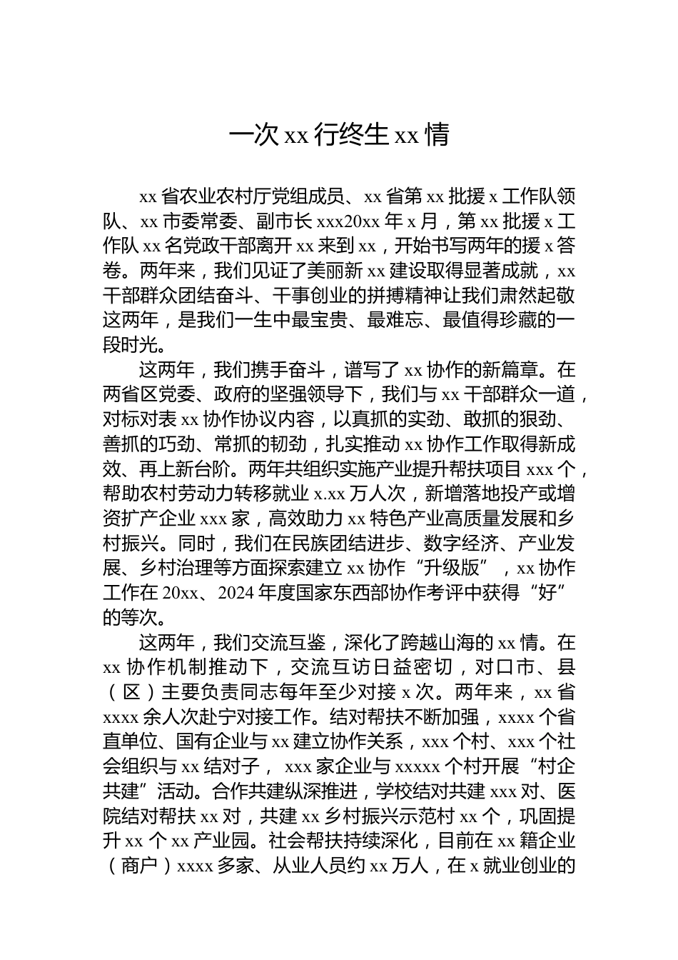 掛職干部在掛職干部座談會上的發(fā)言材料匯編(11篇)目錄1.一次xx行終生xx情.................................................................22.xx協(xié)作的接力棒我們會穩(wěn)穩(wěn)傳下去.....................................53.xx人民“旱塬播綠”的堅韌永遠激勵我們前行.................74.xx的故事因每一位奮斗者而更加精彩...............................105.做好xx兩地的“聯(lián)絡員”“服務員”和“宣傳員”.......136.立足新起點拓展新思路開創(chuàng)新局面....................................157.掛職煉真知力行見實效.....................................................