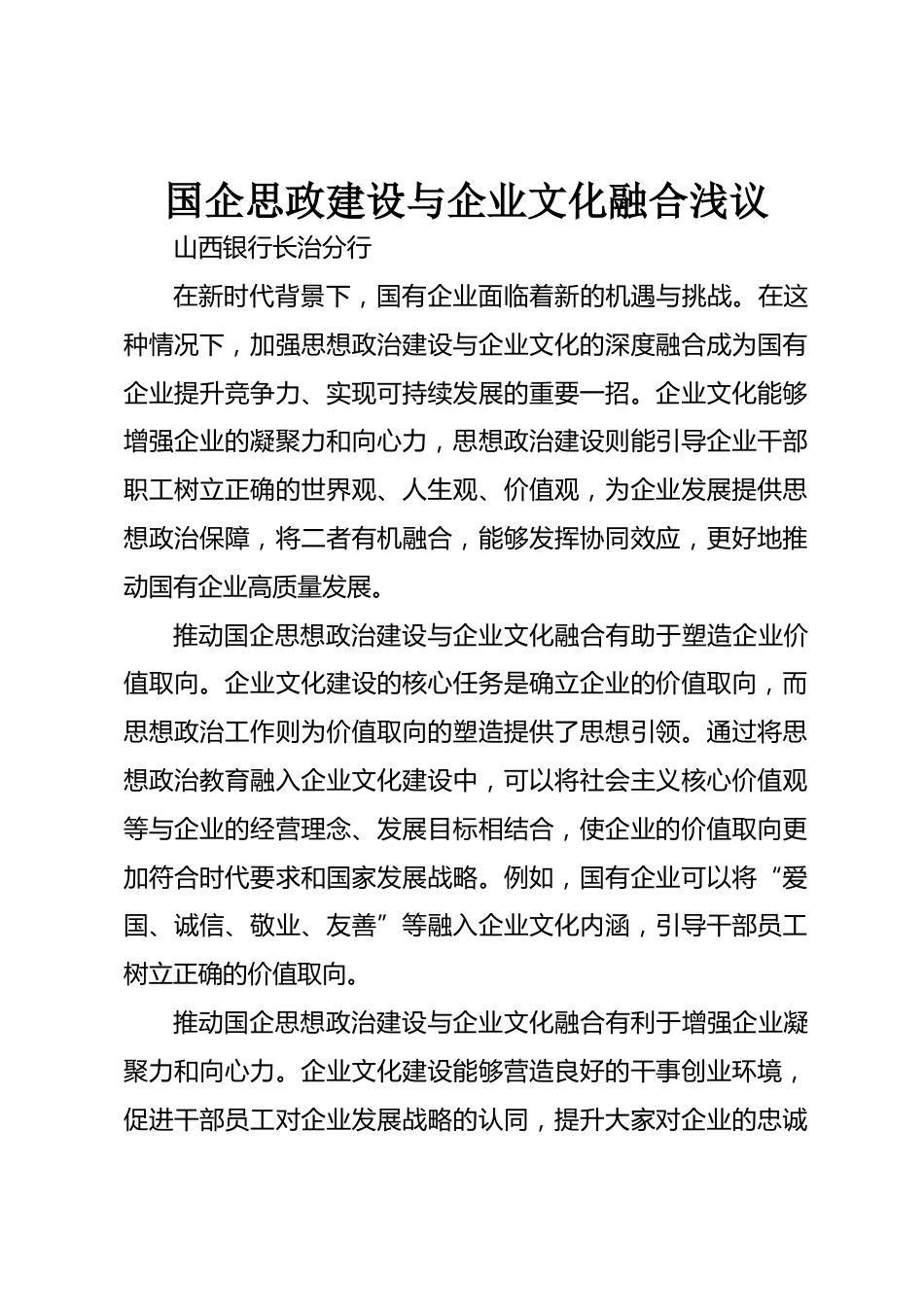 國企思政建設(shè)與企業(yè)文化融合淺議山西銀行長治分行在新時代背景下,國有企業(yè)面臨著新的機遇與挑戰(zhàn)。在這種情況下,加強思想政治建設(shè)與企業(yè)文化的深度融合成為國有企業(yè)提升競爭力、實現(xiàn)可持續(xù)發(fā)展的重要一招。企業(yè)文化能夠增強企業(yè)的凝聚力和向心力,思想政治建設(shè)則能引導(dǎo)企業(yè)干部職工樹立正確的世界觀、人生觀、價值觀,為企業(yè)發(fā)展提供思想政治保障,將二者有機融合,能夠發(fā)揮協(xié)同效應(yīng),更好地推動國有企業(yè)高質(zhì)量發(fā)展。推動國企思想政治建設(shè)與企業(yè)文化融合有助于塑造企業(yè)價值取向。企業(yè)文化建設(shè)的核心任務(wù)是確立企業(yè)的價值取向,而思想政治工作則為價值取向的塑造提供了思...
