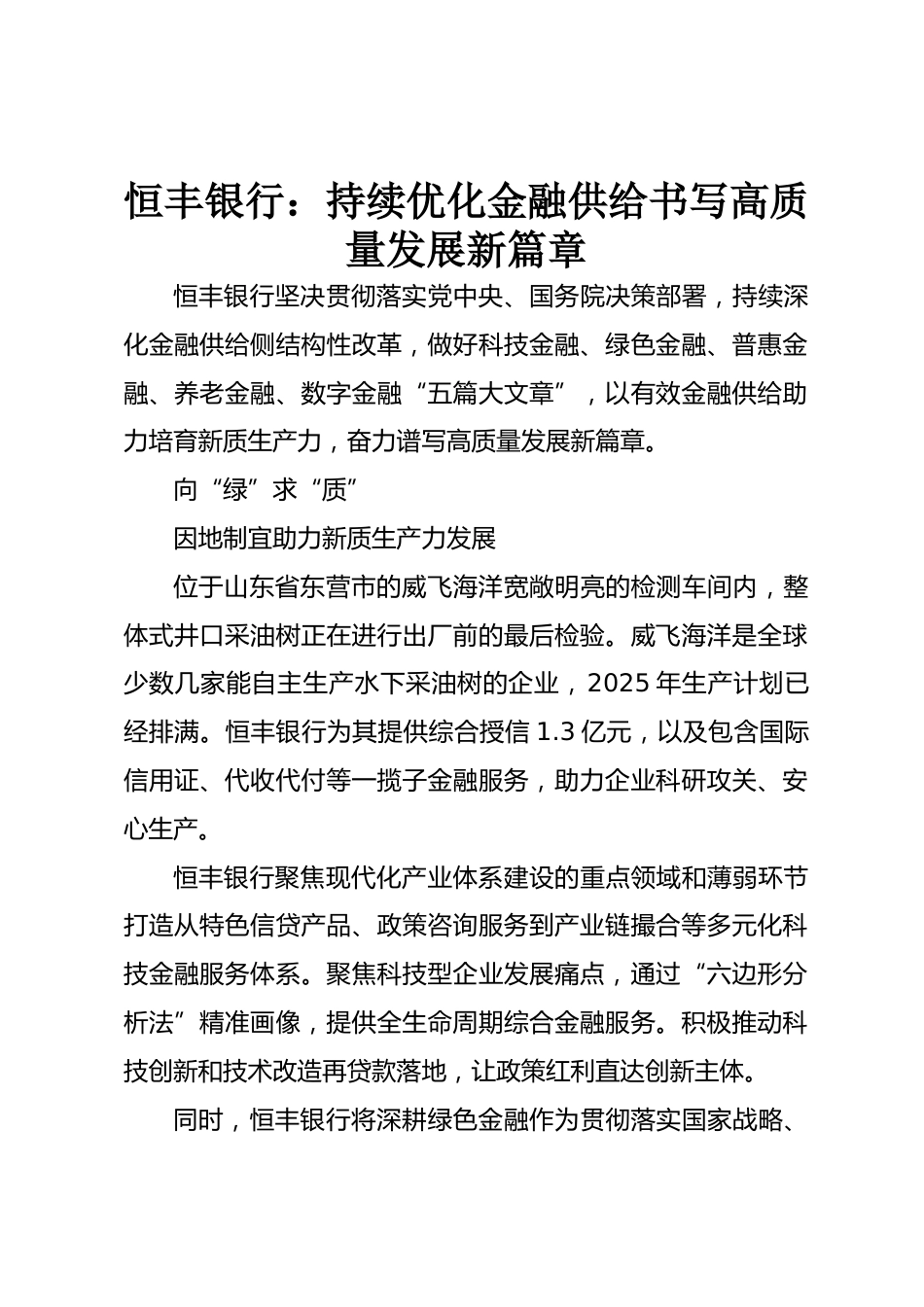恒豐銀行:持續(xù)優(yōu)化金融供給書寫高質(zhì)量發(fā)展新篇章恒豐銀行堅決貫徹落實黨中央、國務(wù)院決策部署,持續(xù)深化金融供給側(cè)結(jié)構(gòu)性改革,做好科技金融、綠色金融、普惠金融、養(yǎng)老金融、數(shù)字金融“五篇大文章”,以有效金融供給助力培育新質(zhì)生產(chǎn)力,奮力譜寫高質(zhì)量發(fā)展新篇章。向“綠”求“質(zhì)”因地制宜助力新質(zhì)生產(chǎn)力發(fā)展位于山東省東營市的威飛海洋寬敞明亮的檢測車間內(nèi),整體式井口采油樹正在進行出廠前的最后檢驗。威飛海洋是全球少數(shù)幾家能自主生產(chǎn)水下采油樹的企業(yè),2025年生產(chǎn)計劃已經(jīng)排滿。恒豐銀行為其提供綜合授信1.3億元,以及包含國際信用證、代收代付等一攬子金融服...