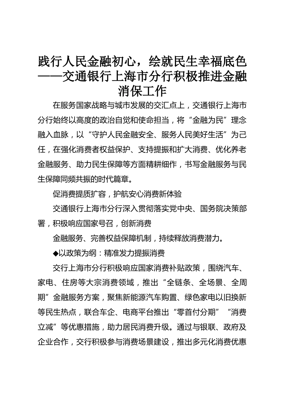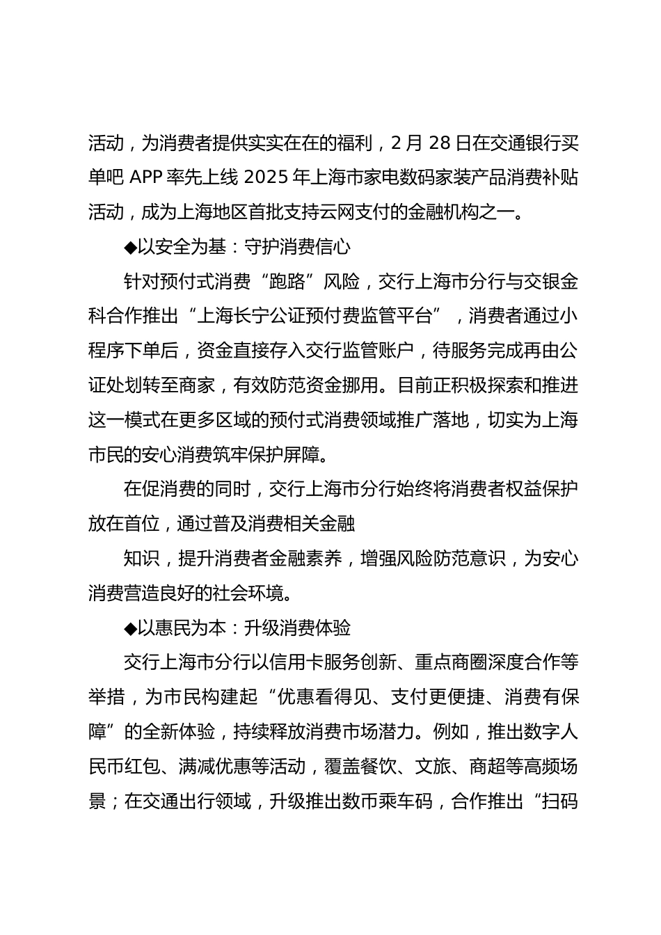 踐行人民金融初心,繪就民生幸福底色——交通銀行上海市分行積極推進金融消保工作在服務(wù)國家戰(zhàn)略與城市發(fā)展的交匯點上,交通銀行上海市分行始終以高度的政治自覺和使命擔當,將“金融為民”理念融入血脈,以“守護人民金融安全、服務(wù)人民美好生活”為己任,在強化消費者權(quán)益保護、支持提振和擴大消費、優(yōu)化養(yǎng)老金融服務(wù)、助力民生保障等方面精耕細作,書寫金融服務(wù)與民生保障同頻共振的時代篇章。促消費提質(zhì)擴容,護航安心消費新體驗交通銀行上海市分行深入貫徹落實黨中央、國務(wù)院決策部署,積極響應(yīng)國家號召,創(chuàng)新消費金融服務(wù)、完善權(quán)益保障機制,持續(xù)釋放消費潛力?!?..