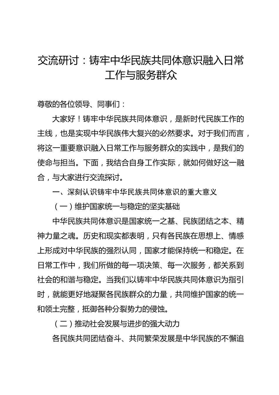 交流研討發(fā)言:鑄牢中華民族共同體意識融入日常工作與服務(wù)群眾