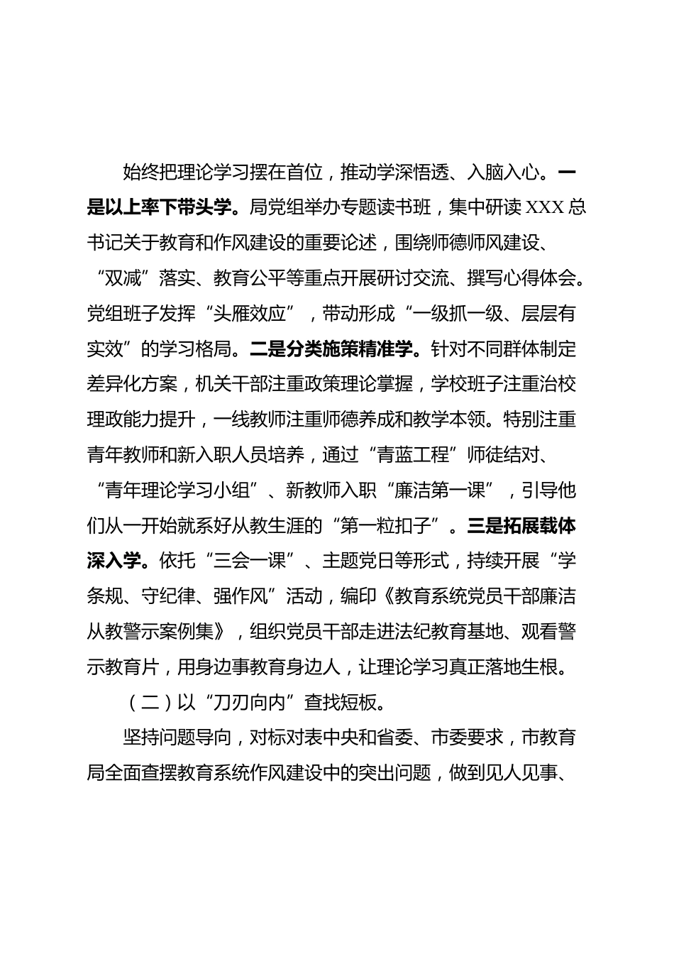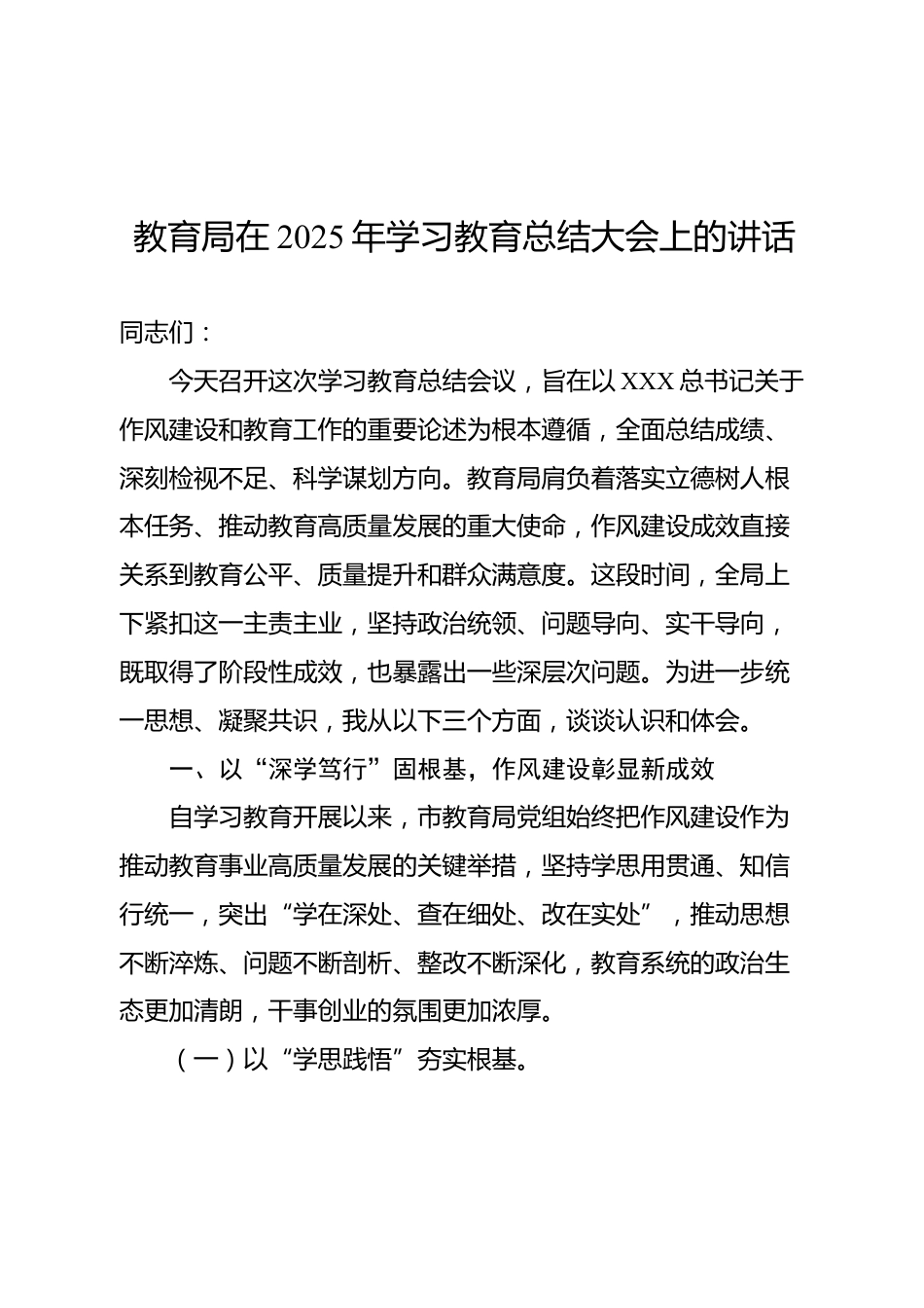 教育局在2025年學(xué)習(xí)教育總結(jié)大會上的講話同志們:今天召開這次學(xué)習(xí)教育總結(jié)會議,旨在以XXX總書記關(guān)于作風(fēng)建設(shè)和教育工作的重要論述為根本遵循,全面總結(jié)成績、深刻檢視不足、科學(xué)謀劃方向。教育局肩負(fù)著落實立德樹人根本任務(wù)、推動教育高質(zhì)量發(fā)展的重大使命,作風(fēng)建設(shè)成效直接關(guān)系到教育公平、質(zhì)量提升和群眾滿意度。這段時間,全局上下緊扣這一主責(zé)主業(yè),堅持政治統(tǒng)領(lǐng)、問題導(dǎo)向、實干導(dǎo)向,既取得了階段性成效,也暴露出一些深層次問題。為進一步統(tǒng)一思想、凝聚共識,我從以下三個方面,談?wù)務(wù)J識和體會。一、以“深學(xué)篤行”固根基,作風(fēng)建設(shè)彰顯新成效自學(xué)習(xí)教育開展...