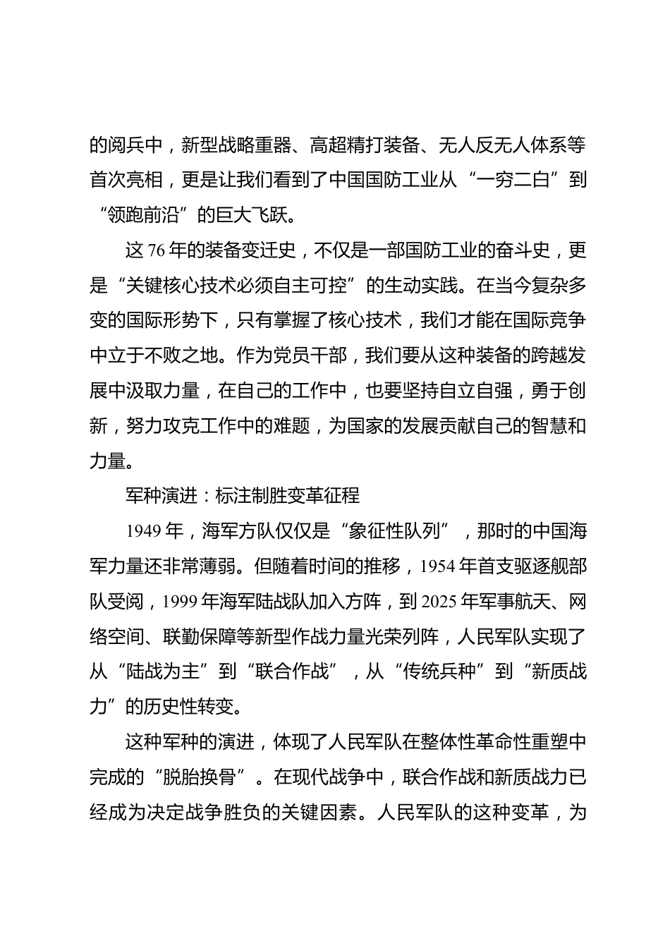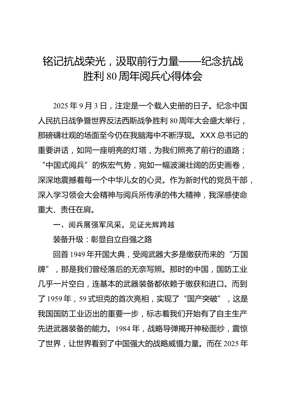 銘記抗戰(zhàn)榮光,汲取前行力量——紀念抗戰(zhàn)勝利80周年閱兵心得體會2025年9月3日,注定是一個載入史冊的日子。紀念中國人民抗日戰(zhàn)爭暨世界反法西斯戰(zhàn)爭勝利80周年大會盛大舉行,那磅礴壯觀的場面至今仍在我腦海中不斷浮現(xiàn)。XXX總書記的重要講話,如同一座明亮的燈塔,為我們照亮了前行的道路;“中國式閱兵”的恢宏氣勢,宛如一幅波瀾壯闊的歷史畫卷,深深地震撼著每一個中華兒女的心靈。作為新時代的黨員干部,深入學(xué)習(xí)領(lǐng)會大會精神與閱兵所傳承的偉大精神,我深感使命重大、責(zé)任在肩。一、閱兵展強軍風(fēng)采,見證光輝跨越裝備升級:彰顯自立自強之路回首1949年開國大典,受...