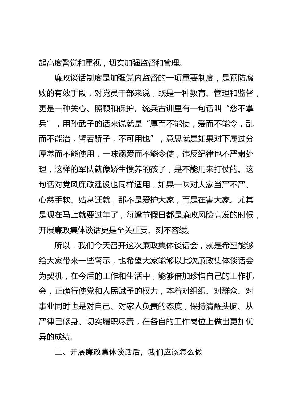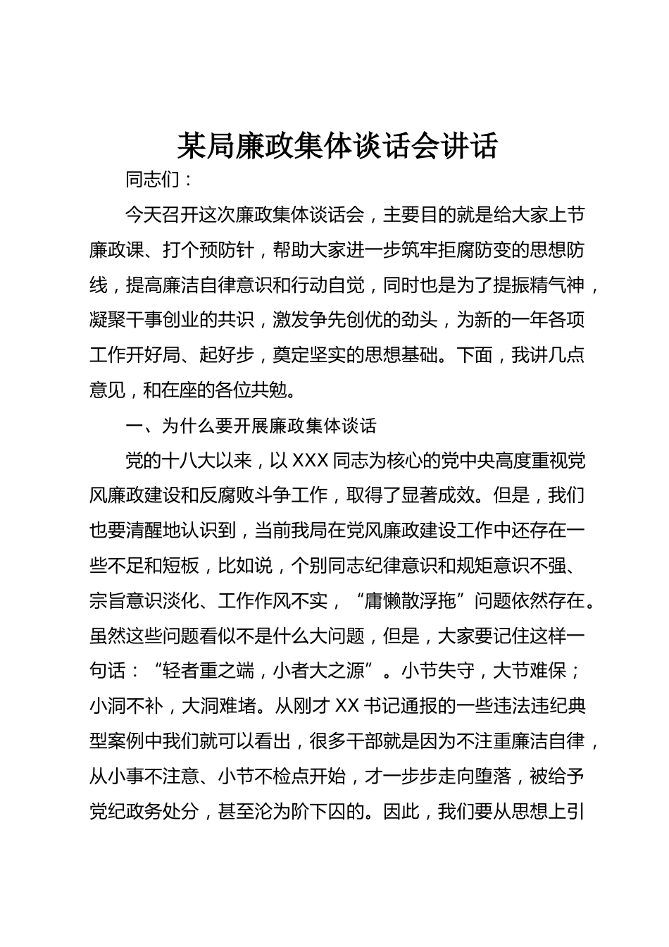 某局廉政集體談話會(huì)講話同志們:今天召開這次廉政集體談話會(huì),主要目的就是給大家上節(jié)廉政課、打個(gè)預(yù)防針,幫助大家進(jìn)一步筑牢拒腐防變的思想防線,提高廉潔自律意識(shí)和行動(dòng)自覺,同時(shí)也是為了提振精氣神,凝聚干事創(chuàng)業(yè)的共識(shí),激發(fā)爭(zhēng)先創(chuàng)優(yōu)的勁頭,為新的一年各項(xiàng)工作開好局、起好步,奠定堅(jiān)實(shí)的思想基礎(chǔ)。下面,我講幾點(diǎn)意見,和在座的各位共勉。一、為什么要開展廉政集體談話黨的十八大以來(lái),以XXX同志為核心的黨中央高度重視黨風(fēng)廉政建設(shè)和反腐敗斗爭(zhēng)工作,取得了顯著成效。但是,我們也要清醒地認(rèn)識(shí)到,當(dāng)前我局在黨風(fēng)廉政建設(shè)工作中還存在一些不足和短板,比如說(shuō),...