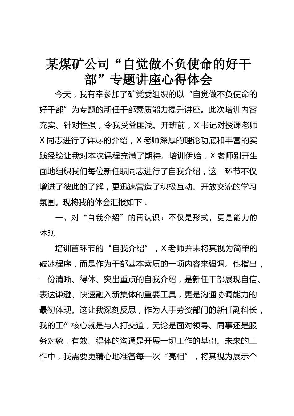 某煤礦公司“自覺做不負使命的好干部”專題講座心得體會今天,我有幸參加了礦黨委組織的以“自覺做不負使命的好干部”為專題的新任干部素質(zhì)能力提升講座。此次培訓內(nèi)容充實、針對性強,令我受益匪淺。開班前,X書記對授課老師X同志進行了詳盡的介紹,X老師深厚的理論功底和豐富的實踐經(jīng)驗讓我對本次課程充滿了期待。培訓伊始,X老師別開生面地組織我們每位新任職同志進行了自我介紹,這一環(huán)節(jié)不僅增進了彼此的了解,更迅速營造了積極互動、開放交流的學習氛圍。現(xiàn)將我的體會匯報如下:一、對“自我介紹”的再認識:不僅是形式,更是能力的體現(xiàn)培訓首環(huán)節(jié)的“自我介紹”,...