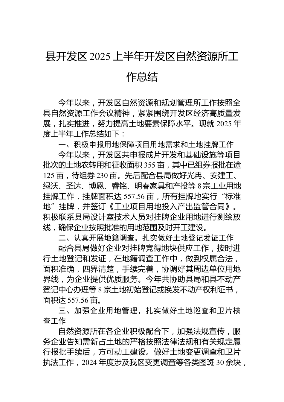 縣開發(fā)區(qū)2025上半年開發(fā)區(qū)自然資源所工作總結(jié)今年以來,開發(fā)區(qū)自然資源和規(guī)劃管理所工作按照全縣自然資源工作會議精神,緊緊圍繞開發(fā)區(qū)經(jīng)濟高質(zhì)量發(fā)展,扎實推進(jìn),努力提高土地要素保障水平?,F(xiàn)就2025年度上半年工作總結(jié)如下:一、積極申報用地保障項目用地需求和土地掛牌工作今年以來,開發(fā)區(qū)共申報成片開發(fā)和基礎(chǔ)設(shè)施等項目批次的土地農(nóng)轉(zhuǎn)用和征收面積355畝,其中已組券報批在途125畝,待組券230畝。先后配合縣局做好光冉、安建工、綠沃、圣達(dá)、博恩、睿銘、明春家具和產(chǎn)投等8宗工業(yè)用地掛牌工作,掛牌面積達(dá)557.56畝,所有掛牌地實行“標(biāo)準(zhǔn)地”掛牌,并簽訂《工業(yè)項目...