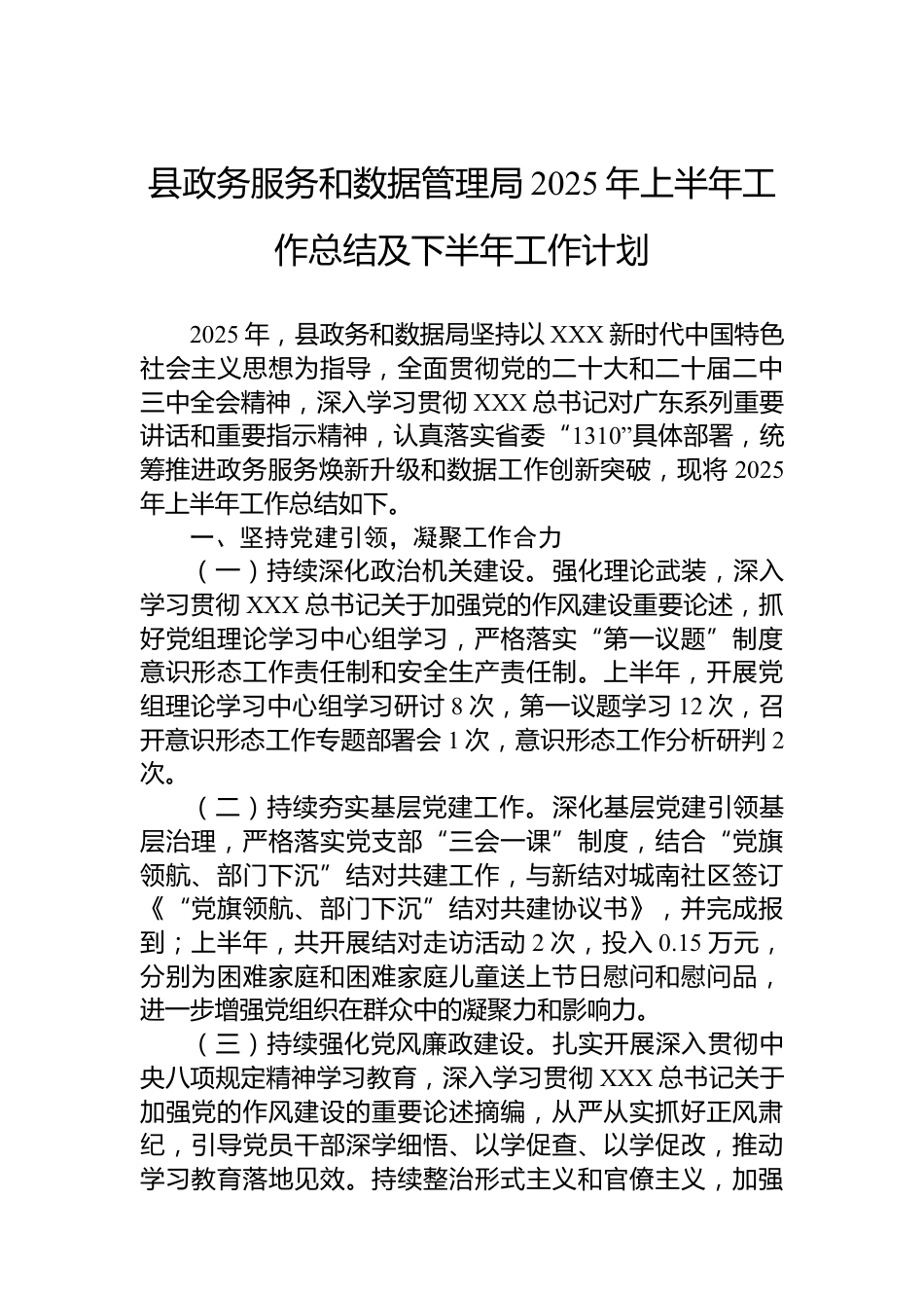 縣政務(wù)服務(wù)和數(shù)據(jù)管理局2025年上半年工作總結(jié)及下半年工作計(jì)劃2025年,縣政務(wù)和數(shù)據(jù)局堅(jiān)持以XXX新時(shí)代中國特色社會(huì)主義思想為指導(dǎo),全面貫徹黨的二十大和二十屆二中三中全會(huì)精神,深入學(xué)習(xí)貫徹XXX總書記對廣東系列重要講話和重要指示精神,認(rèn)真落實(shí)省委“1310”具體部署,統(tǒng)籌推進(jìn)政務(wù)服務(wù)煥新升級和數(shù)據(jù)工作創(chuàng)新突破,現(xiàn)將2025年上半年工作總結(jié)如下。一、堅(jiān)持黨建引領(lǐng),凝聚工作合力(一)持續(xù)深化政治機(jī)關(guān)建設(shè)。強(qiáng)化理論武裝,深入學(xué)習(xí)貫徹XXX總書記關(guān)于加強(qiáng)黨的作風(fēng)建設(shè)重要論述,抓好黨組理論學(xué)習(xí)中心組學(xué)習(xí),嚴(yán)格落實(shí)“第一議題”制度意識形態(tài)工作責(zé)任制和安全生產(chǎn)...