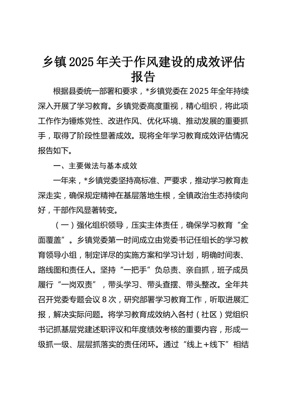 鄉(xiāng)鎮(zhèn)2025年關(guān)于作風(fēng)建設(shè)的成效評估報(bào)告根據(jù)縣委統(tǒng)一部署和要求,*鄉(xiāng)鎮(zhèn)黨委在2025年全年持續(xù)深入開展了學(xué)習(xí)教育。鄉(xiāng)鎮(zhèn)黨委高度重視,精心組織,將此項(xiàng)工作作為錘煉黨性、改進(jìn)作風(fēng)、優(yōu)化環(huán)境、推動(dòng)發(fā)展的重要抓手,取得了階段性顯著成效。現(xiàn)將全年學(xué)習(xí)教育成效評估情況報(bào)告如下。一、主要做法與基本成效一年來,*鄉(xiāng)鎮(zhèn)黨委堅(jiān)持高標(biāo)準(zhǔn)、嚴(yán)要求,推動(dòng)學(xué)習(xí)教育走深走實(shí),確保規(guī)定精神在基層落地生根,全鎮(zhèn)政治生態(tài)持續(xù)向好,干部作風(fēng)顯著轉(zhuǎn)變。(一)強(qiáng)化組織領(lǐng)導(dǎo),壓實(shí)主體責(zé)任,確保學(xué)習(xí)教育“全面覆蓋”。鄉(xiāng)鎮(zhèn)黨委第一時(shí)間成立由黨委書記任組長的學(xué)習(xí)教育領(lǐng)導(dǎo)小組,制定詳盡...