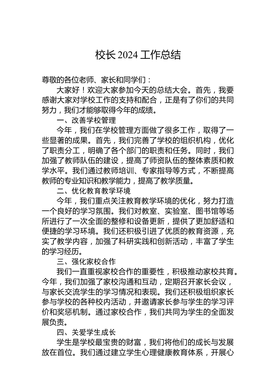 校長2024工作總結(jié)尊敬的各位老師、家長和同學(xué)們:大家好!歡迎大家參加今天的總結(jié)大會。首先,我要感謝大家對學(xué)校工作的支持和配合,正是有了你們的共同努力,我們才能夠取得今年的成績。一、改善學(xué)校管理今年,我們在學(xué)校管理方面做了很多工作,取得了一些顯著的成果。首先,我們完善了學(xué)校的組織機(jī)構(gòu),優(yōu)化了職責(zé)分工,明確了各個部門的職責(zé)和任務(wù)。同時,我們加強(qiáng)了教師隊(duì)伍的建設(shè),提高了師資隊(duì)伍的整體素質(zhì)和教學(xué)水平。我們通過教師培訓(xùn)、專家指導(dǎo)等方式,不斷提高教師的專業(yè)知識和教學(xué)能力,提高了教學(xué)質(zhì)量。二、優(yōu)化教育教學(xué)環(huán)境今年,我們重點(diǎn)關(guān)注教育教學(xué)環(huán)境的...