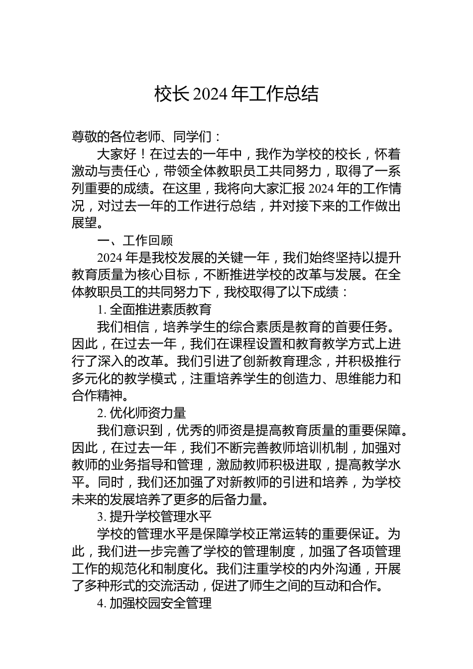 校長2024年工作總結(jié)尊敬的各位老師、同學們:大家好!在過去的一年中,我作為學校的校長,懷著激動與責任心,帶領(lǐng)全體教職員工共同努力,取得了一系列重要的成績。在這里,我將向大家匯報2024年的工作情況,對過去一年的工作進行總結(jié),并對接下來的工作做出展望。一、工作回顧2024年是我校發(fā)展的關(guān)鍵一年,我們始終堅持以提升教育質(zhì)量為核心目標,不斷推進學校的改革與發(fā)展。在全體教職員工的共同努力下,我校取得了以下成績:1.全面推進素質(zhì)教育我們相信,培養(yǎng)學生的綜合素質(zhì)是教育的首要任務(wù)。因此,在過去一年,我們在課程設(shè)置和教育教學方式上進行了深入的改革。我們...