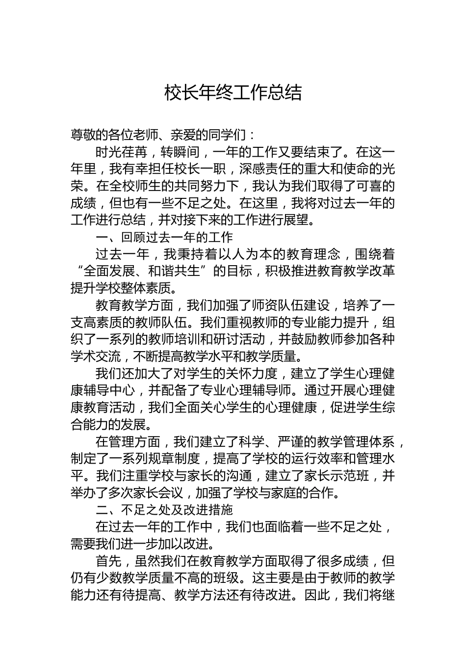 校長年終工作總結(jié)尊敬的各位老師、親愛的同學們:時光荏苒,轉(zhuǎn)瞬間,一年的工作又要結(jié)束了。在這一年里,我有幸擔任校長一職,深感責任的重大和使命的光榮。在全校師生的共同努力下,我認為我們?nèi)〉昧丝上驳某煽儯灿幸恍┎蛔阒?。在這里,我將對過去一年的工作進行總結(jié),并對接下來的工作進行展望。一、回顧過去一年的工作過去一年,我秉持著以人為本的教育理念,圍繞著“全面發(fā)展、和諧共生”的目標,積極推進教育教學改革提升學校整體素質(zhì)。教育教學方面,我們加強了師資隊伍建設,培養(yǎng)了一支高素質(zhì)的教師隊伍。我們重視教師的專業(yè)能力提升,組織了一系列的教師培...