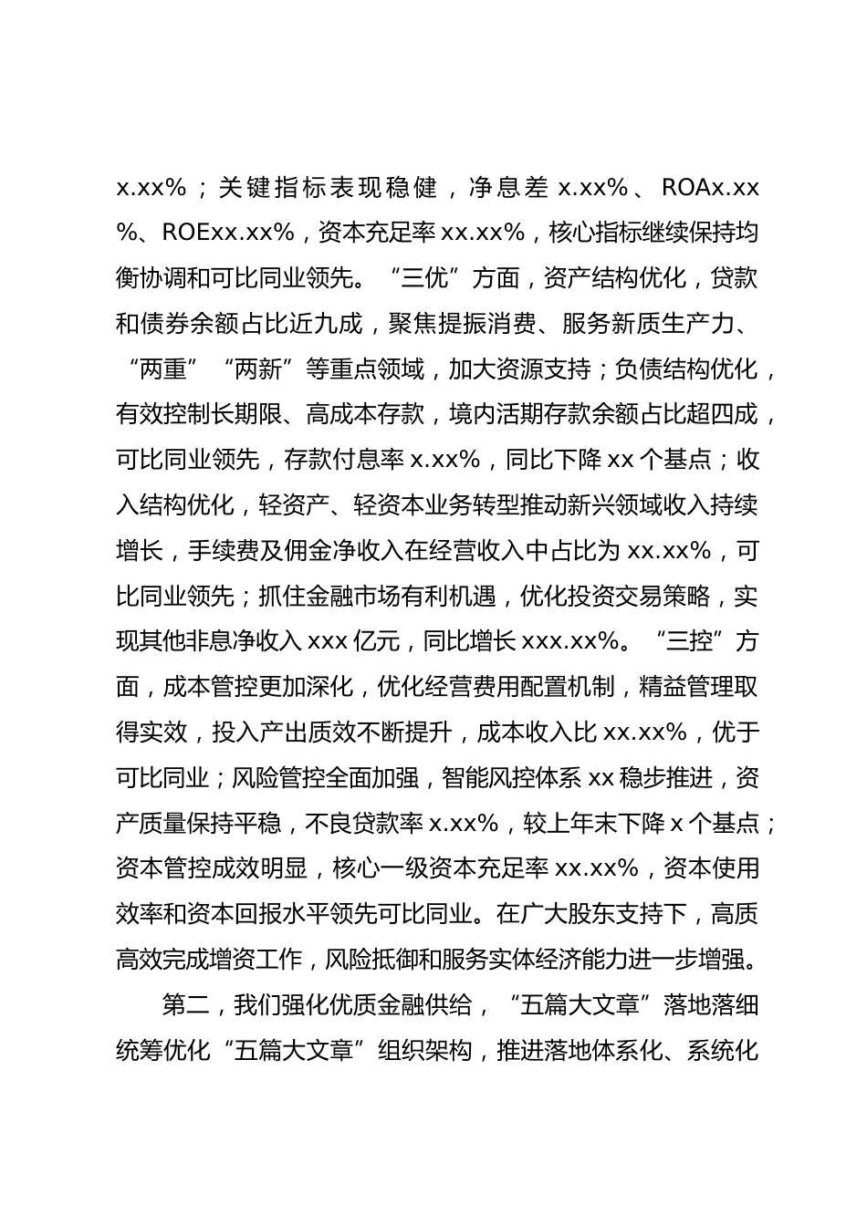 行長(zhǎng)在2025年中期業(yè)績(jī)發(fā)布會(huì)上的致辭1尊敬的各位投資者、分析師、媒體朋友們:大家下午好!歡迎各位蒞臨xx銀行2025年中期業(yè)績(jī)發(fā)布會(huì),衷心感謝大家一直以來的關(guān)心、信任和支持!今年以來,xx銀行堅(jiān)持以XXX新時(shí)代中國(guó)特色社會(huì)主義思想為指導(dǎo),堅(jiān)決貫徹落實(shí)黨中央、國(guó)務(wù)院決策部署,堅(jiān)持穩(wěn)中求進(jìn)工作總基調(diào),切實(shí)增強(qiáng)“三個(gè)能力”,以質(zhì)的有效提升引領(lǐng)量的合理增長(zhǎng),扎實(shí)推進(jìn)內(nèi)涵式高質(zhì)量發(fā)展。x.xxx.xxx.xxxxx.xxx.x績(jī),關(guān)鍵經(jīng)營(yíng)指標(biāo)企穩(wěn)向好,經(jīng)營(yíng)收入x,xxx億元,同比增長(zhǎng)x.xx%;手續(xù)費(fèi)及傭金凈收入xxx億元,同比增長(zhǎng)x.xx%;撥備前利潤(rùn)x,xxx億元,同比增長(zhǎng)x.xx%;撥備...