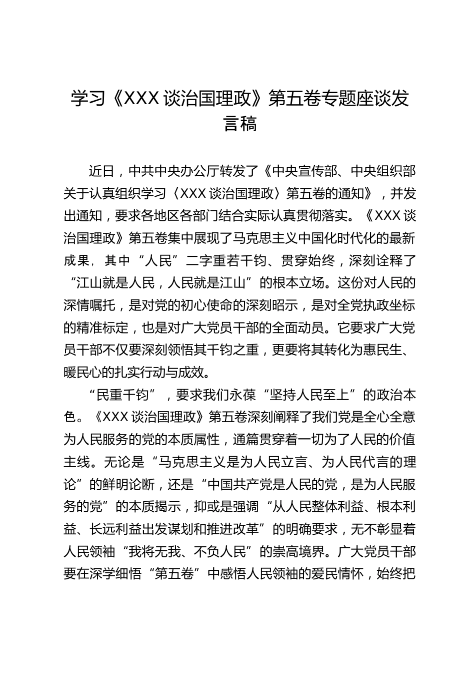 學(xué)習(xí)《XXX談治國(guó)理政》第五卷專題座談發(fā)言稿近日,中共中央辦公廳轉(zhuǎn)發(fā)了《中央宣傳部、中央組織部關(guān)于認(rèn)真組織學(xué)習(xí)〈XXX談治國(guó)理政〉第五卷的通知》,并發(fā)出通知,要求各地區(qū)各部門結(jié)合實(shí)際認(rèn)真貫徹落實(shí)。《XXX談治國(guó)理政》第五卷集中展現(xiàn)了馬克思主義中國(guó)化時(shí)代化的最新成果,其中“人民”二字重若千鈞、貫穿始終,深刻詮釋了“江山就是人民,人民就是江山”的根本立場(chǎng)。這份對(duì)人民的深情囑托,是對(duì)黨的初心使命的深刻昭示,是對(duì)全黨執(zhí)政坐標(biāo)的精準(zhǔn)標(biāo)定,也是對(duì)廣大黨員干部的全面動(dòng)員。它要求廣大黨員干部不僅要深刻領(lǐng)悟其千鈞之重,更要將其轉(zhuǎn)化為惠民生、暖民心的扎...