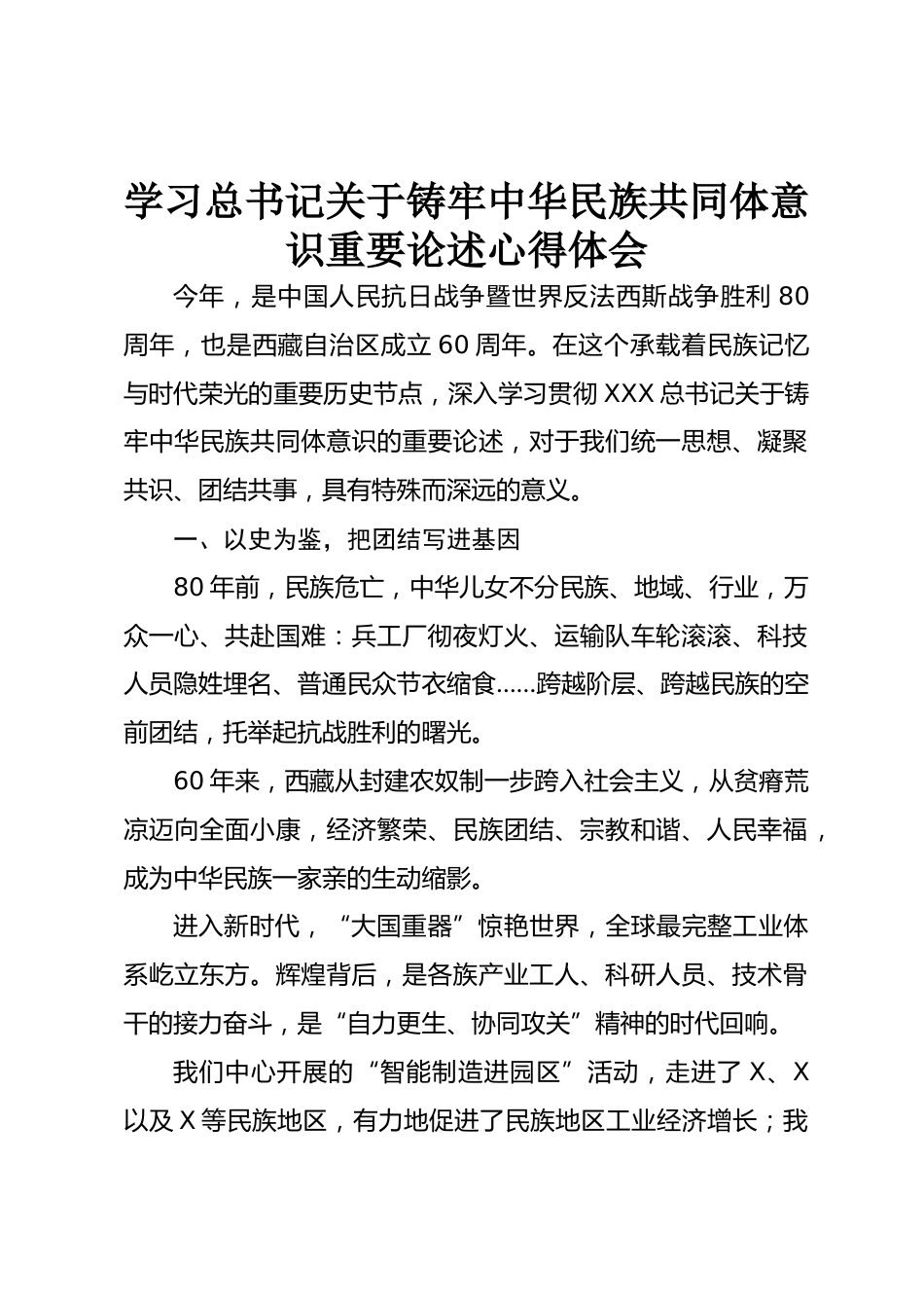 學(xué)習(xí)總書記關(guān)于鑄牢中華民族共同體意識(shí)重要論述心得體會(huì)今年,是中國(guó)人民抗日戰(zhàn)爭(zhēng)暨世界反法西斯戰(zhàn)爭(zhēng)勝利80周年,也是西藏自治區(qū)成立60周年。在這個(gè)承載著民族記憶與時(shí)代榮光的重要?dú)v史節(jié)點(diǎn),深入學(xué)習(xí)貫徹XXX總書記關(guān)于鑄牢中華民族共同體意識(shí)的重要論述,對(duì)于我們統(tǒng)一思想、凝聚共識(shí)、團(tuán)結(jié)共事,具有特殊而深遠(yuǎn)的意義。一、以史為鑒,把團(tuán)結(jié)寫進(jìn)基因80年前,民族危亡,中華兒女不分民族、地域、行業(yè),萬(wàn)眾一心、共赴國(guó)難:兵工廠徹夜燈火、運(yùn)輸隊(duì)車輪滾滾、科技人員隱姓埋名、普通民眾節(jié)衣縮食……跨越階層、跨越民族的空前團(tuán)結(jié),托舉起抗戰(zhàn)勝利的曙光。60年來(lái),西藏從...