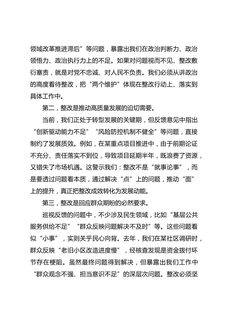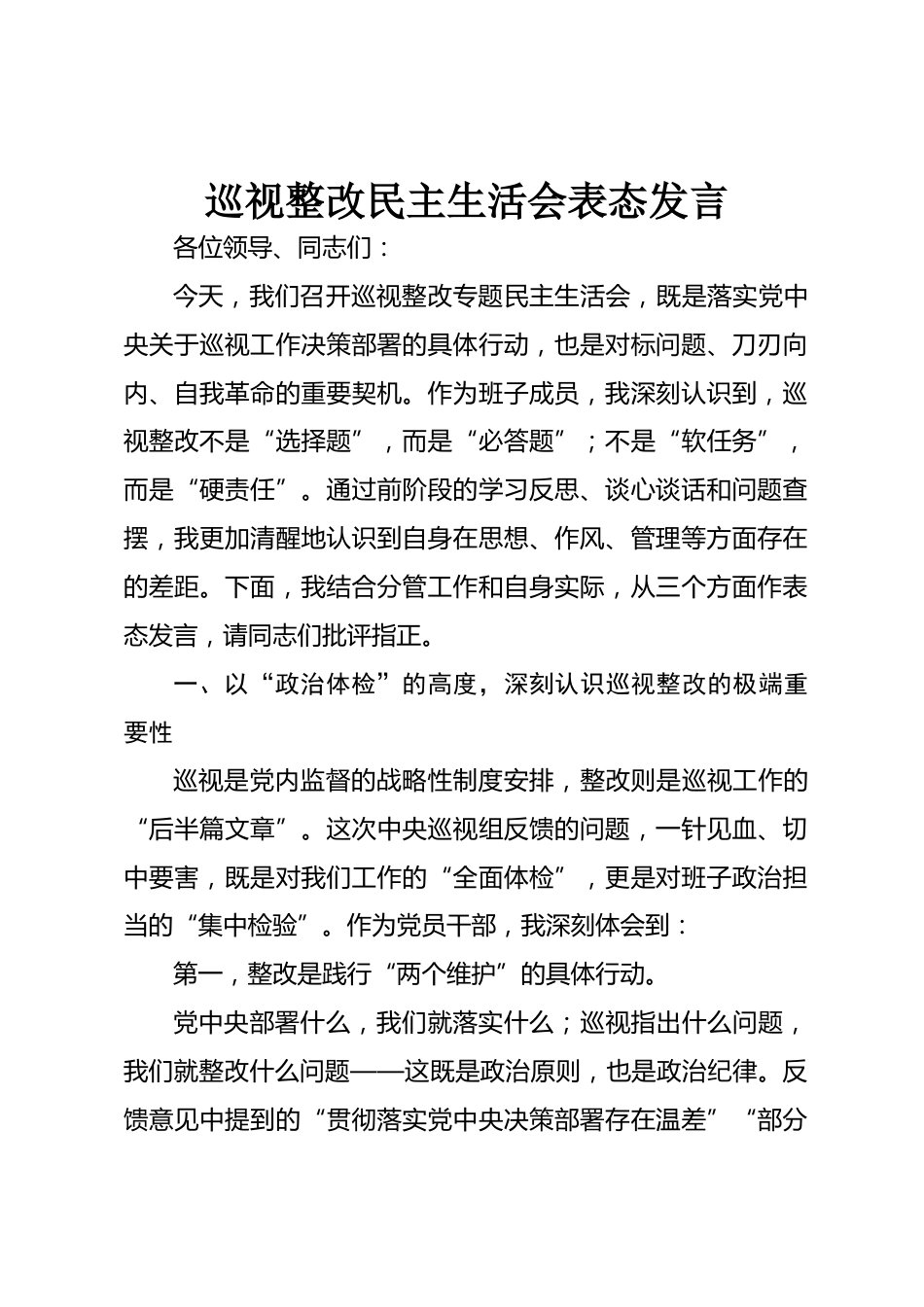 巡視整改民主生活會表態(tài)發(fā)言各位領(lǐng)導(dǎo)、同志們:今天,我們召開巡視整改專題民主生活會,既是落實黨中央關(guān)于巡視工作決策部署的具體行動,也是對標(biāo)問題、刀刃向內(nèi)、自我革命的重要契機(jī)。作為班子成員,我深刻認(rèn)識到,巡視整改不是“選擇題”,而是“必答題”;不是“軟任務(wù)”,而是“硬責(zé)任”。通過前階段的學(xué)習(xí)反思、談心談話和問題查擺,我更加清醒地認(rèn)識到自身在思想、作風(fēng)、管理等方面存在的差距。下面,我結(jié)合分管工作和自身實際,從三個方面作表態(tài)發(fā)言,請同志們批評指正。一、以“政治體檢”的高度,深刻認(rèn)識巡視整改的極端重要性巡視是黨內(nèi)監(jiān)督的戰(zhàn)略性制度安排,...