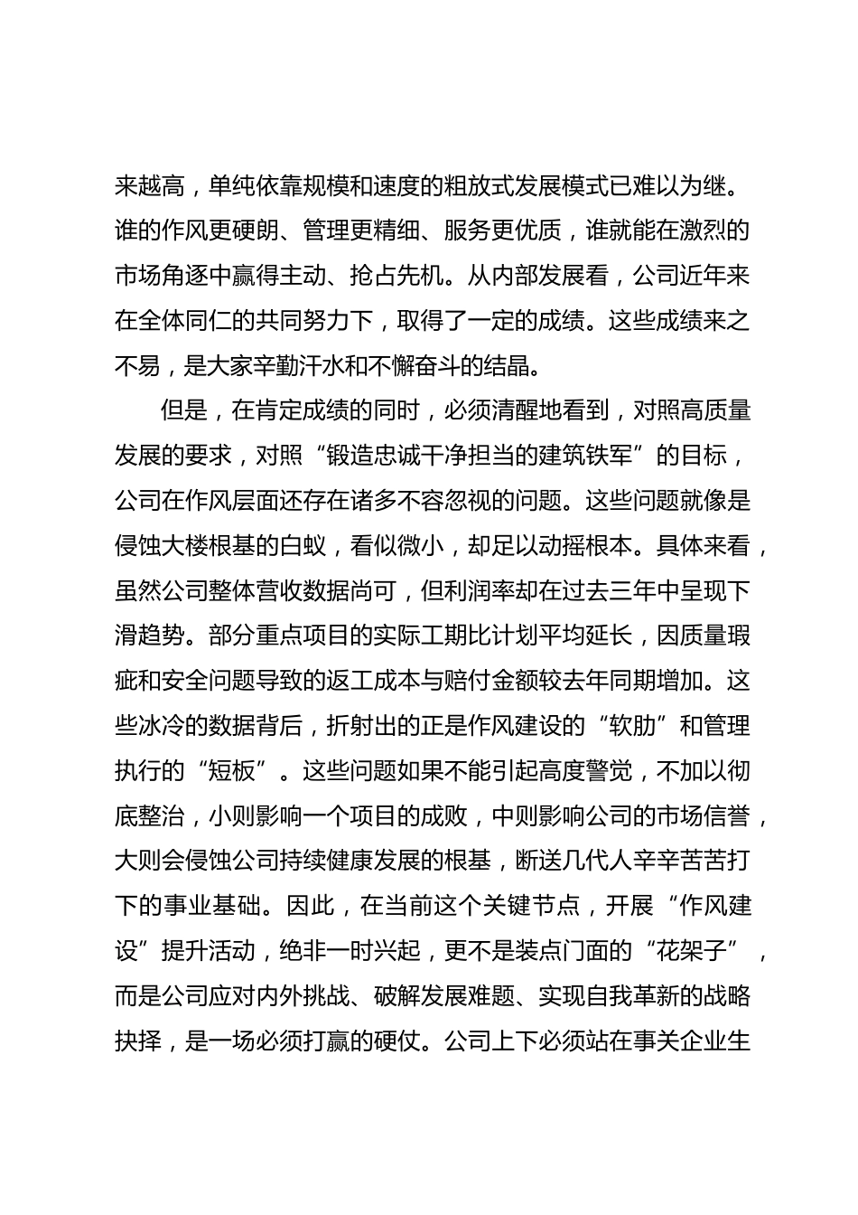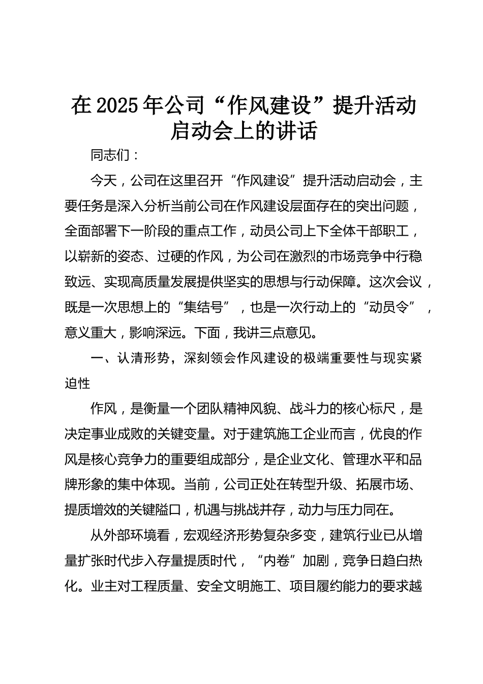 在2025年公司“作風建設”提升活動啟動會上的講話同志們:今天,公司在這里召開“作風建設”提升活動啟動會,主要任務是深入分析當前公司在作風建設層面存在的突出問題,全面部署下一階段的重點工作,動員公司上下全體干部職工,以嶄新的姿態(tài)、過硬的作風,為公司在激烈的市場競爭中行穩(wěn)致遠、實現高質量發(fā)展提供堅實的思想與行動保障。這次會議,既是一次思想上的“集結號”,也是一次行動上的“動員令”,意義重大,影響深遠。下面,我講三點意見。一、認清形勢,深刻領會作風建設的極端重要性與現實緊迫性作風,是衡量一個團隊精神風貌、戰(zhàn)斗力的核心標尺,是決定事業(yè)...