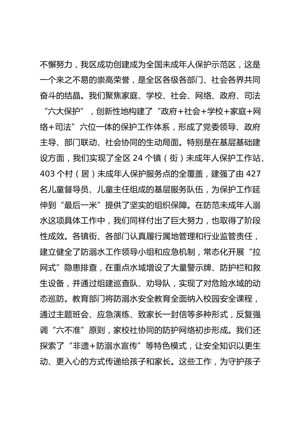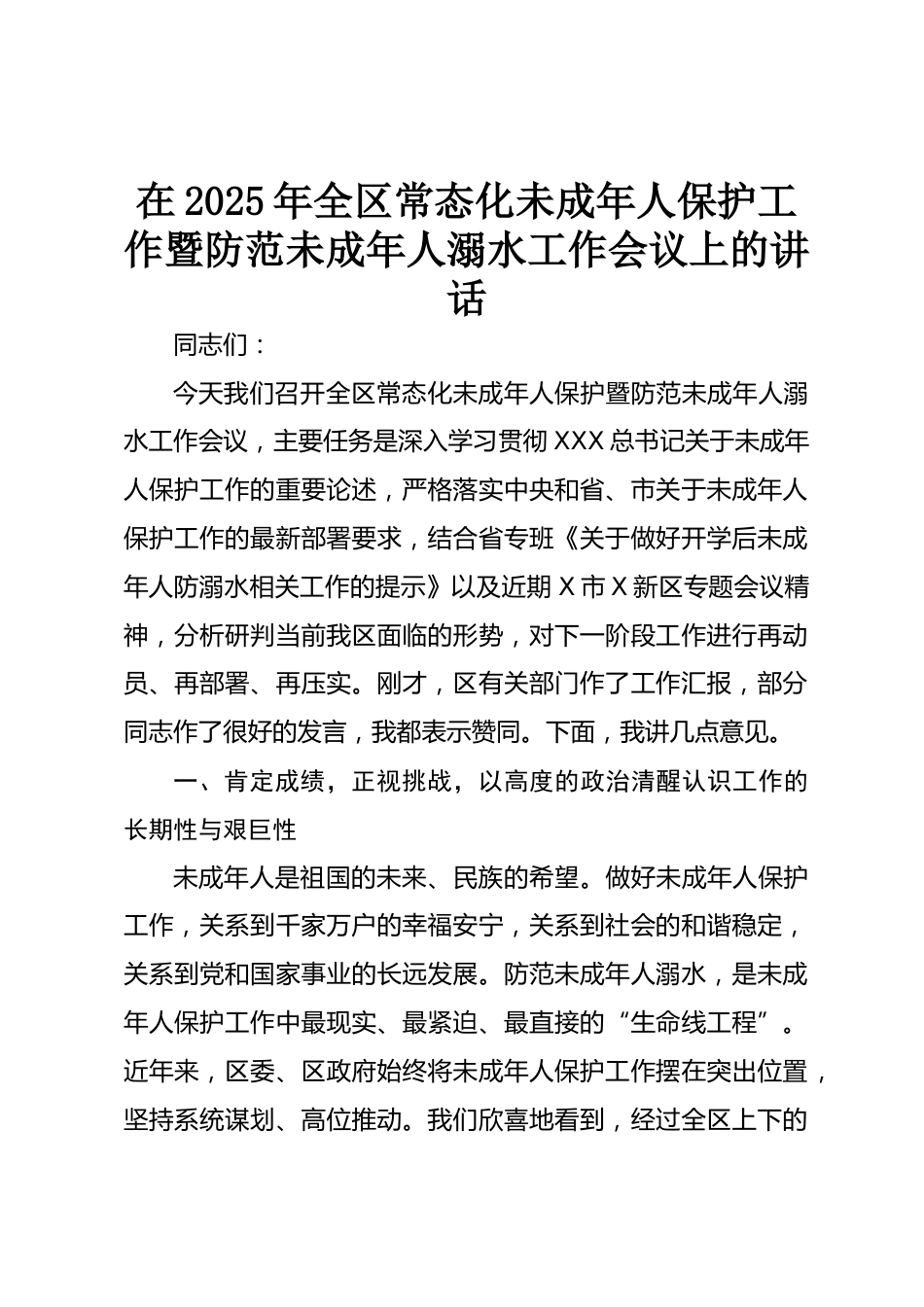 在2025年全區(qū)常態(tài)化未成年人保護工作暨防范未成年人溺水工作會議上的講話同志們:今天我們召開全區(qū)常態(tài)化未成年人保護暨防范未成年人溺水工作會議,主要任務(wù)是深入學(xué)習(xí)貫徹XXX總書記關(guān)于未成年人保護工作的重要論述,嚴格落實中央和省、市關(guān)于未成年人保護工作的最新部署要求,結(jié)合省專班《關(guān)于做好開學(xué)后未成年人防溺水相關(guān)工作的提示》以及近期X市X新區(qū)專題會議精神,分析研判當(dāng)前我區(qū)面臨的形勢,對下一階段工作進行再動員、再部署、再壓實。剛才,區(qū)有關(guān)部門作了工作匯報,部分同志作了很好的發(fā)言,我都表示贊同。下面,我講幾點意見。一、肯定成績,正視挑戰(zhàn),以高...