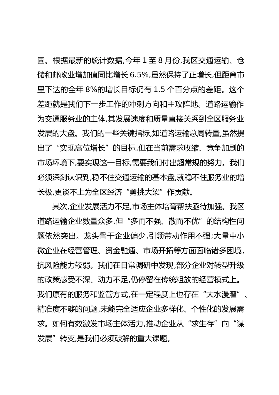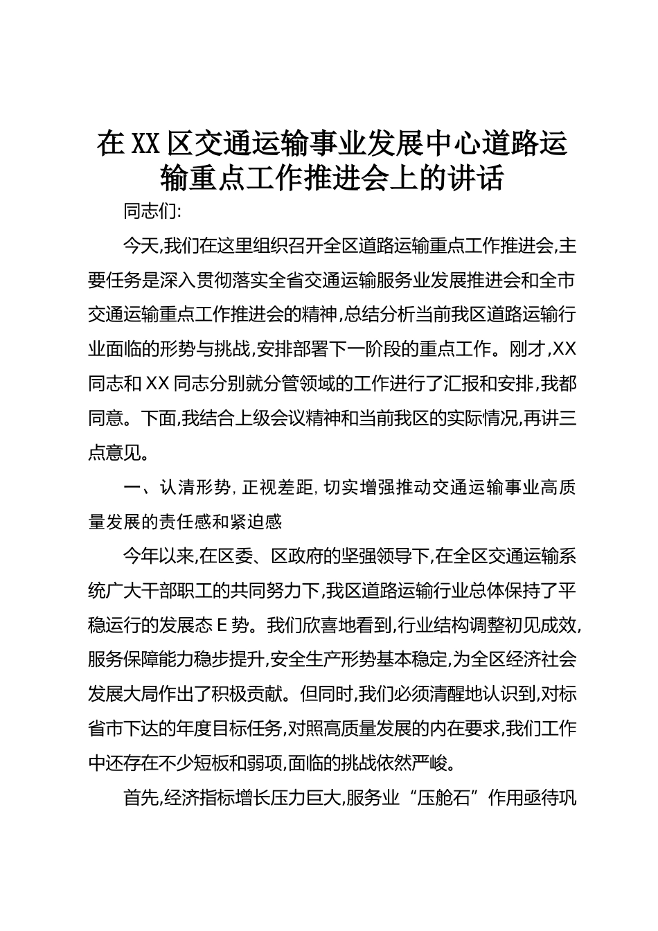 在XX區(qū)交通運輸事業(yè)發(fā)展中心道路運輸重點工作推進會上的講話同志們:今天,我們在這里組織召開全區(qū)道路運輸重點工作推進會,主要任務(wù)是深入貫徹落實全省交通運輸服務(wù)業(yè)發(fā)展推進會和全市交通運輸重點工作推進會的精神,總結(jié)分析當前我區(qū)道路運輸行業(yè)面臨的形勢與挑戰(zhàn),安排部署下一階段的重點工作。剛才,XX同志和XX同志分別就分管領(lǐng)域的工作進行了匯報和安排,我都同意。下面,我結(jié)合上級會議精神和當前我區(qū)的實際情況,再講三點意見。一、認清形勢,正視差距,切實增強推動交通運輸事業(yè)高質(zhì)量發(fā)展的責任感和緊迫感今年以來,在區(qū)委、區(qū)政府的堅強領(lǐng)導下,在全區(qū)交通運輸系統(tǒng)廣大干部...