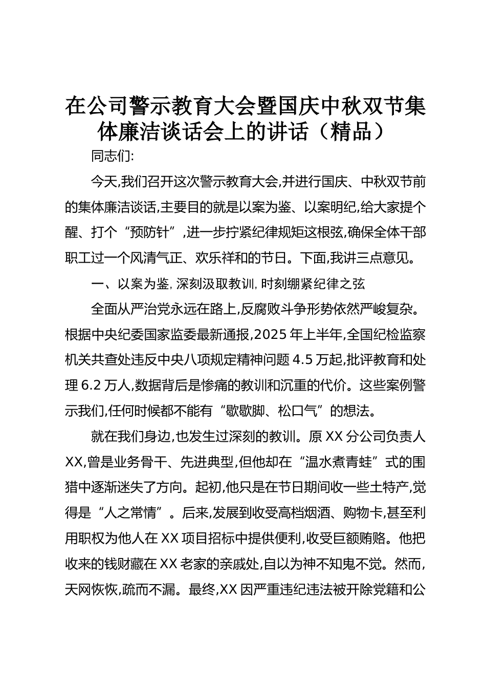 在公司警示教育大會(huì)暨國(guó)慶中秋雙節(jié)集體廉潔談話會(huì)上的講話(精品)同志們:今天,我們召開這次警示教育大會(huì),并進(jìn)行國(guó)慶、中秋雙節(jié)前的集體廉潔談話,主要目的就是以案為鑒、以案明紀(jì),給大家提個(gè)醒、打個(gè)“預(yù)防針”,進(jìn)一步擰緊紀(jì)律規(guī)矩這根弦,確保全體干部職工過(guò)一個(gè)風(fēng)清氣正、歡樂(lè)祥和的節(jié)日。下面,我講三點(diǎn)意見。一、以案為鑒,深刻汲取教訓(xùn),時(shí)刻繃緊紀(jì)律之弦全面從嚴(yán)治黨永遠(yuǎn)在路上,反腐敗斗爭(zhēng)形勢(shì)依然嚴(yán)峻復(fù)雜。根據(jù)中央紀(jì)委國(guó)家監(jiān)委最新通報(bào),2025年上半年,全國(guó)紀(jì)檢監(jiān)察機(jī)關(guān)共查處違反中央八項(xiàng)規(guī)定精神問(wèn)題4.5萬(wàn)起,批評(píng)教育和處理6.2萬(wàn)人,數(shù)據(jù)背后是慘痛的教訓(xùn)和沉重的代...