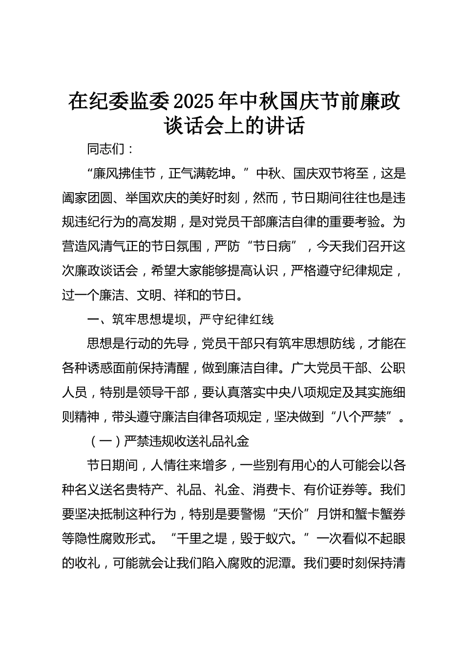 在紀(jì)委監(jiān)委2025年中秋國慶節(jié)前廉政談話會(huì)上的講話同志們:“廉風(fēng)拂佳節(jié),正氣滿乾坤?!敝星?、國慶雙節(jié)將至,這是闔家團(tuán)圓、舉國歡慶的美好時(shí)刻,然而,節(jié)日期間往往也是違規(guī)違紀(jì)行為的高發(fā)期,是對(duì)黨員干部廉潔自律的重要考驗(yàn)。為營造風(fēng)清氣正的節(jié)日氛圍,嚴(yán)防“節(jié)日病”,今天我們召開這次廉政談話會(huì),希望大家能夠提高認(rèn)識(shí),嚴(yán)格遵守紀(jì)律規(guī)定,過一個(gè)廉潔、文明、祥和的節(jié)日。一、筑牢思想堤壩,嚴(yán)守紀(jì)律紅線思想是行動(dòng)的先導(dǎo),黨員干部只有筑牢思想防線,才能在各種誘惑面前保持清醒,做到廉潔自律。廣大黨員干部、公職人員,特別是領(lǐng)導(dǎo)干部,要認(rèn)真落實(shí)中央八項(xiàng)規(guī)定...