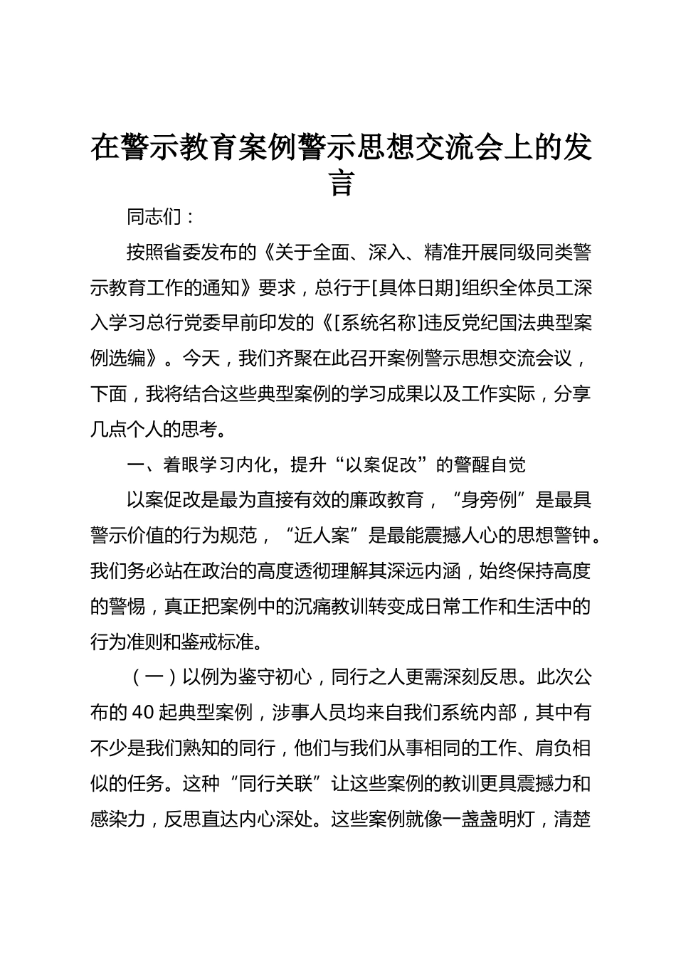 在警示教育案例警示思想交流會上的發(fā)言同志們:按照省委發(fā)布的《關(guān)于全面、深入、精準開展同級同類警示教育工作的通知》要求,總行于[具體日期]組織全體員工深入學習總行黨委早前印發(fā)的《[系統(tǒng)名稱]違反黨紀國法典型案例選編》。今天,我們齊聚在此召開案例警示思想交流會議,下面,我將結(jié)合這些典型案例的學習成果以及工作實際,分享幾點個人的思考。一、著眼學習內(nèi)化,提升“以案促改”的警醒自覺以案促改是最為直接有效的廉政教育,“身旁例”是最具警示價值的行為規(guī)范,“近人案”是最能震撼人心的思想警鐘。我們務(wù)必站在政治的高度透徹理解其深遠內(nèi)涵,始終保持高度...
