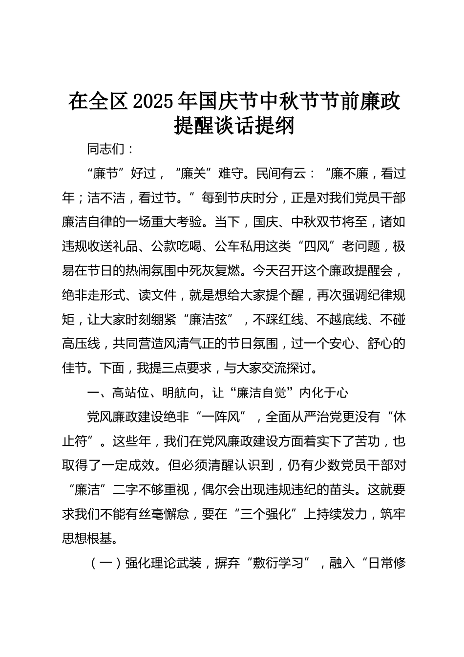 在全區(qū)2025年國(guó)慶節(jié)中秋節(jié)節(jié)前廉政提醒談話提綱