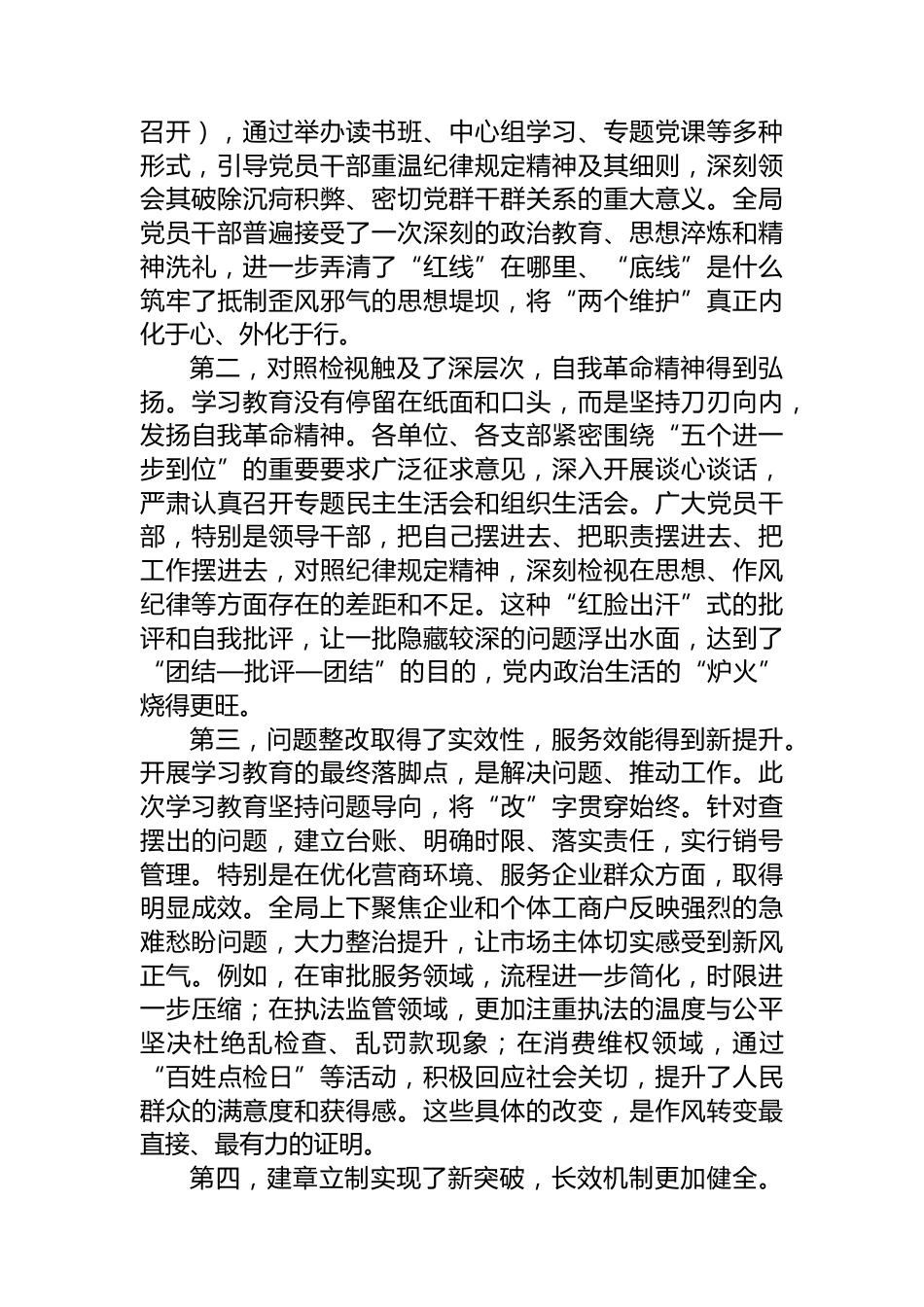 在市場(chǎng)監(jiān)督管理局黨組(擴(kuò)大)會(huì)議暨作風(fēng)建設(shè)總結(jié)會(huì)上的講話同志們:今天,我們?cè)谶@里召開(kāi)市局黨組(擴(kuò)大)會(huì)議,同時(shí)也是一次全局深入貫徹學(xué)習(xí)教育的總結(jié)會(huì)。主要任務(wù)是,全面回顧總結(jié)前一階段學(xué)習(xí)教育的成果與經(jīng)驗(yàn),深入分析當(dāng)前作風(fēng)建設(shè)依然存在的短板與不足,并對(duì)下一步鞏固深化學(xué)習(xí)教育成果、推動(dòng)作風(fēng)建設(shè)常態(tài)化長(zhǎng)效化進(jìn)行再動(dòng)員再部署。自學(xué)習(xí)教育開(kāi)展以來(lái),在市委的堅(jiān)強(qiáng)領(lǐng)導(dǎo)和市委學(xué)習(xí)教育第X督導(dǎo)組的悉心指導(dǎo)下會(huì)議暨深入貫徹學(xué)習(xí)教育總結(jié)會(huì)召開(kāi)),全局上下將此項(xiàng)工作作為一項(xiàng)重大政治任務(wù)來(lái)抓,精心組織,周密安排,一體推進(jìn)學(xué)、查、改各項(xiàng)工作,達(dá)到了深化思...