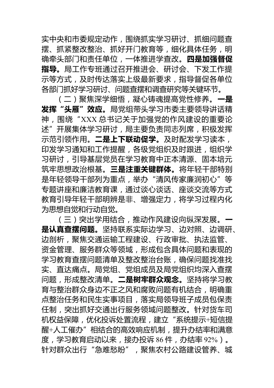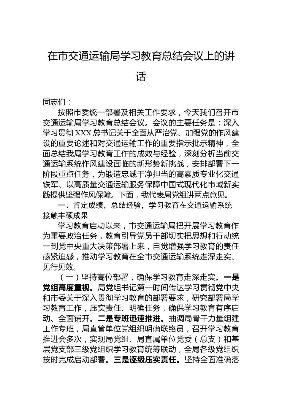 在市交通運(yùn)輸局學(xué)習(xí)教育總結(jié)會(huì)議上的講話同志們:按照市委統(tǒng)一部署及相關(guān)工作要求,今天我們召開市交通運(yùn)輸局學(xué)習(xí)教育總結(jié)會(huì)議。會(huì)議的主要任務(wù)是:深入學(xué)習(xí)貫徹XXX總書記關(guān)于全面從嚴(yán)治黨、加強(qiáng)黨的作風(fēng)建設(shè)的重要論述和對(duì)交通運(yùn)輸工作的重要指示批示精神,全面總結(jié)我局學(xué)習(xí)教育工作的成效與經(jīng)驗(yàn),深刻分析當(dāng)前交通運(yùn)輸系統(tǒng)作風(fēng)建設(shè)面臨的新形勢(shì)新挑戰(zhàn),安排部署下一階段重點(diǎn)任務(wù),為鍛造忠誠干凈擔(dān)當(dāng)?shù)母咚刭|(zhì)專業(yè)化交通鐵軍、以高質(zhì)量交通運(yùn)輸服務(wù)保障中國式現(xiàn)代化市域新實(shí)踐提供堅(jiān)強(qiáng)作風(fēng)保障。下面,我代表局黨組講兩點(diǎn)意見。一、肯定成績(jī),總結(jié)經(jīng)驗(yàn),學(xué)習(xí)教育在交通...