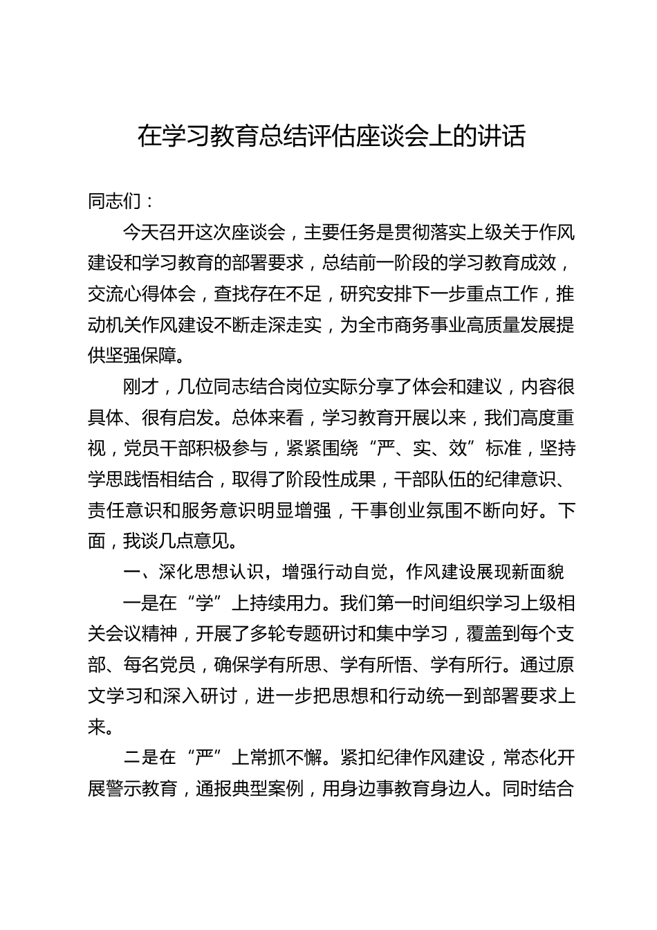 在學(xué)習(xí)教育總結(jié)評(píng)估座談會(huì)上的講話同志們:今天召開這次座談會(huì),主要任務(wù)是貫徹落實(shí)上級(jí)關(guān)于作風(fēng)建設(shè)和學(xué)習(xí)教育的部署要求,總結(jié)前一階段的學(xué)習(xí)教育成效,交流心得體會(huì),查找存在不足,研究安排下一步重點(diǎn)工作,推動(dòng)機(jī)關(guān)作風(fēng)建設(shè)不斷走深走實(shí),為全市商務(wù)事業(yè)高質(zhì)量發(fā)展提供堅(jiān)強(qiáng)保障。剛才,幾位同志結(jié)合崗位實(shí)際分享了體會(huì)和建議,內(nèi)容很具體、很有啟發(fā)??傮w來看,學(xué)習(xí)教育開展以來,我們高度重視,黨員干部積極參與,緊緊圍繞“嚴(yán)、實(shí)、效”標(biāo)準(zhǔn),堅(jiān)持學(xué)思踐悟相結(jié)合,取得了階段性成果,干部隊(duì)伍的紀(jì)律意識(shí)、責(zé)任意識(shí)和服務(wù)意識(shí)明顯增強(qiáng),干事創(chuàng)業(yè)氛圍不斷向好。下面...