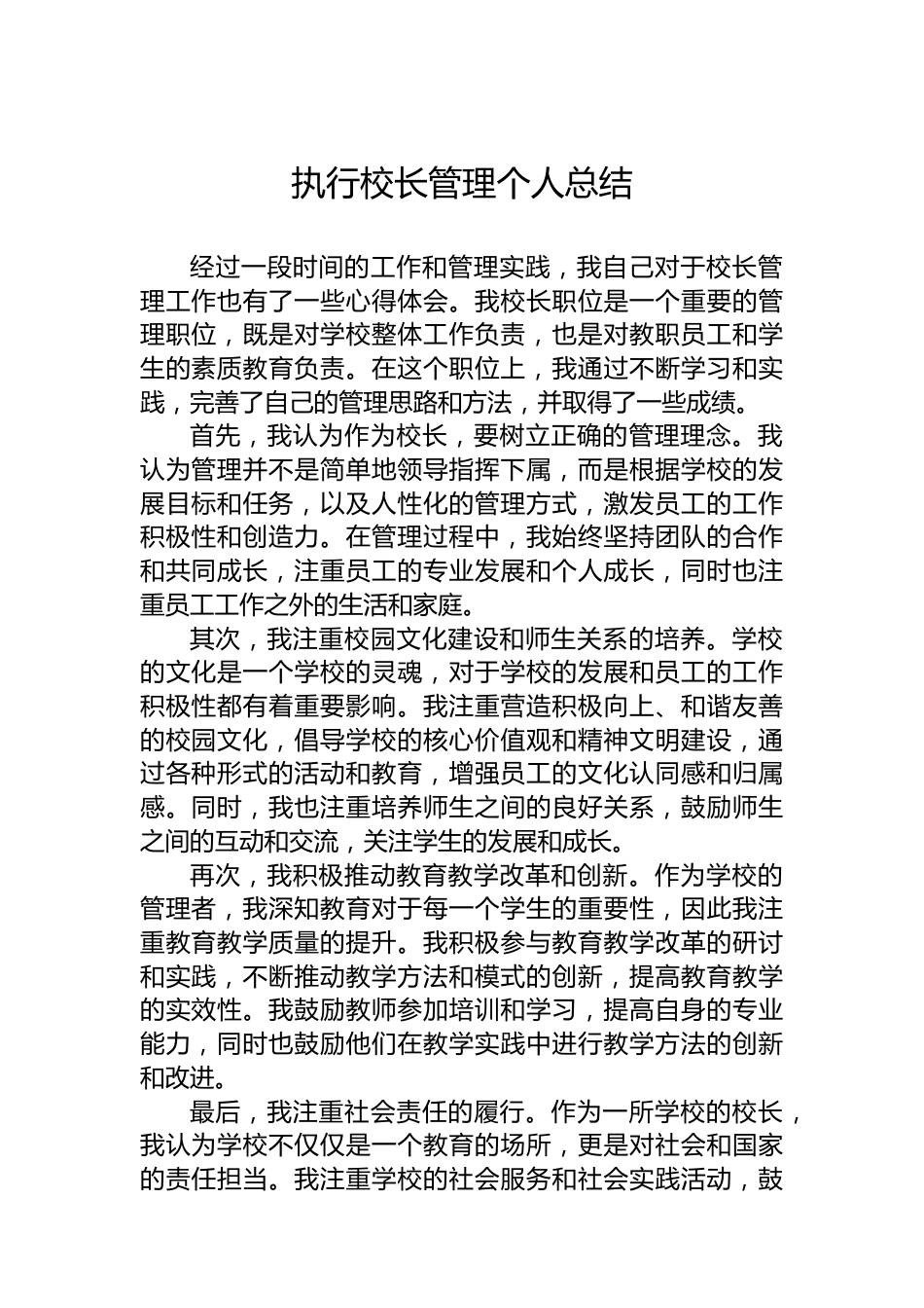 執(zhí)行校長管理個人總結(jié)經(jīng)過一段時間的工作和管理實踐,我自己對于校長管理工作也有了一些心得體會。我校長職位是一個重要的管理職位,既是對學校整體工作負責,也是對教職員工和學生的素質(zhì)教育負責。在這個職位上,我通過不斷學習和實踐,完善了自己的管理思路和方法,并取得了一些成績。首先,我認為作為校長,要樹立正確的管理理念。我認為管理并不是簡單地領導指揮下屬,而是根據(jù)學校的發(fā)展目標和任務,以及人性化的管理方式,激發(fā)員工的工作積極性和創(chuàng)造力。在管理過程中,我始終堅持團隊的合作和共同成長,注重員工的專業(yè)發(fā)展和個人成長,同時也注重員工工作之外的生...