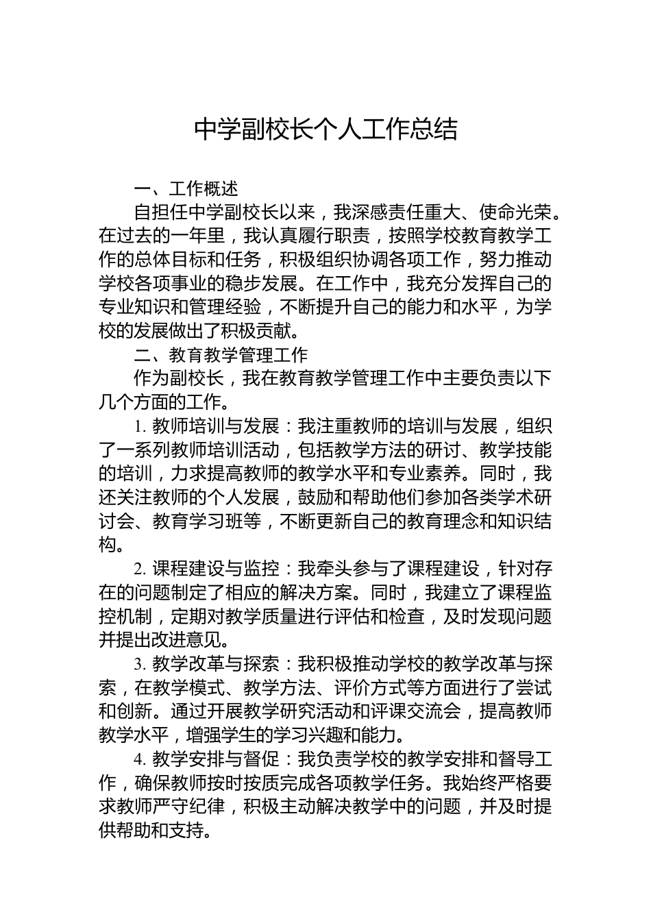 中學副校長個人工作總結一、工作概述自擔任中學副校長以來,我深感責任重大、使命光榮。在過去的一年里,我認真履行職責,按照學校教育教學工作的總體目標和任務,積極組織協調各項工作,努力推動學校各項事業(yè)的穩(wěn)步發(fā)展。在工作中,我充分發(fā)揮自己的專業(yè)知識和管理經驗,不斷提升自己的能力和水平,為學校的發(fā)展做出了積極貢獻。二、教育教學管理工作作為副校長,我在教育教學管理工作中主要負責以下幾個方面的工作。1.教師培訓與發(fā)展:我注重教師的培訓與發(fā)展,組織了一系列教師培訓活動,包括教學方法的研討、教學技能的培訓,力求提高教師的教學水平和專業(yè)素養(yǎng)。同時...