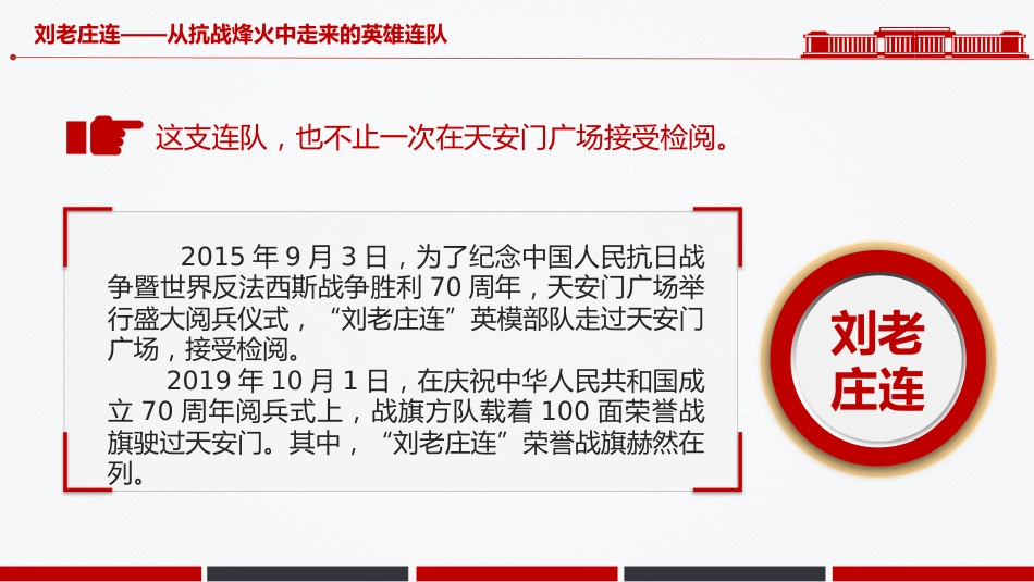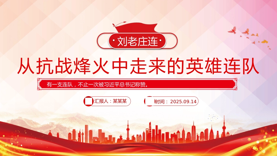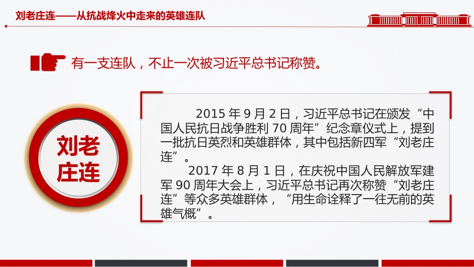 從抗戰(zhàn)烽火中走來的英雄連隊(duì)有一支連隊(duì),不止一次被習(xí)近平總書記稱贊。匯報(bào)人:某某某時(shí)間:2025.09.14劉老莊連劉老莊連——從抗戰(zhàn)烽火中走來的英雄連隊(duì)劉老莊連2015年9月2日,習(xí)近平總書記在頒發(fā)“中國人民抗日戰(zhàn)爭勝利70周年”紀(jì)念章儀式上,提到一批抗日英烈和英雄群體,其中包括新四軍“劉老莊連”。2017年8月1日,在慶祝中國人民解放軍建軍90周年大會上,習(xí)近平總書記再次稱贊“劉老莊連”等眾多英雄群體,“用生命詮釋了一往無前的英雄氣概”。有一支連隊(duì),不止一次被習(xí)近平總書記稱贊。劉老莊連——從抗戰(zhàn)烽火中走來的英雄連隊(duì)這支連隊(duì),也不止一次在天安門廣場接...