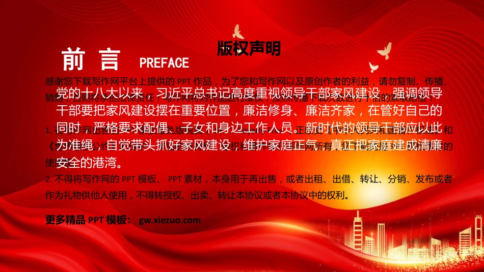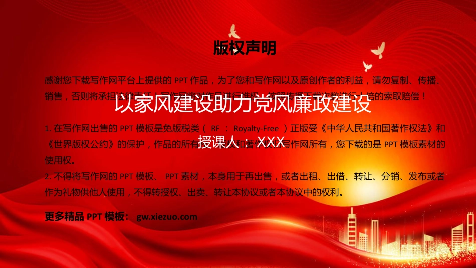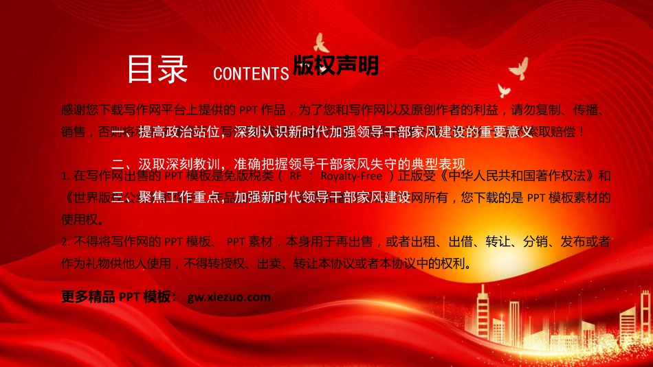 版權(quán)聲明感謝您下載寫作網(wǎng)平臺(tái)上提供的PPT作品,為了您和寫作網(wǎng)以及原創(chuàng)作者的利益,請(qǐng)勿復(fù)制、傳播、銷售,否則將承擔(dān)法律責(zé)任!寫作網(wǎng)將對(duì)作品進(jìn)行維權(quán),按照傳播下載次數(shù)進(jìn)行十倍的索取賠償!1.在寫作網(wǎng)出售的PPT模板是免版稅類(RF:Royalty-Free)正版受《中華人民共和國著作權(quán)法》和《世界版權(quán)公約》的保護(hù),作品的所有權(quán)、版權(quán)和著作權(quán)歸寫作網(wǎng)所有,您下載的是PPT模板素材的使用權(quán)。2.不得將寫作網(wǎng)的PPT模板、PPT素材,本身用于再出售,或者出租、出借、轉(zhuǎn)讓、分銷、發(fā)布或者作為禮物供他人使用,不得轉(zhuǎn)授權(quán)、出賣、轉(zhuǎn)讓本協(xié)議或者本協(xié)議中的權(quán)利。更多精品PPT模...