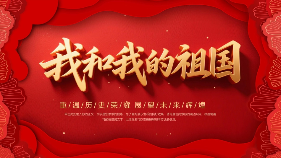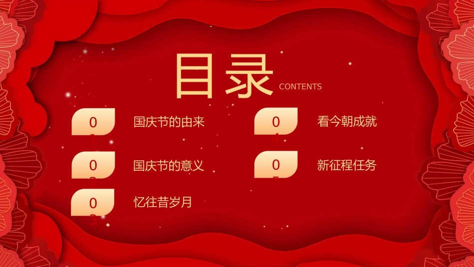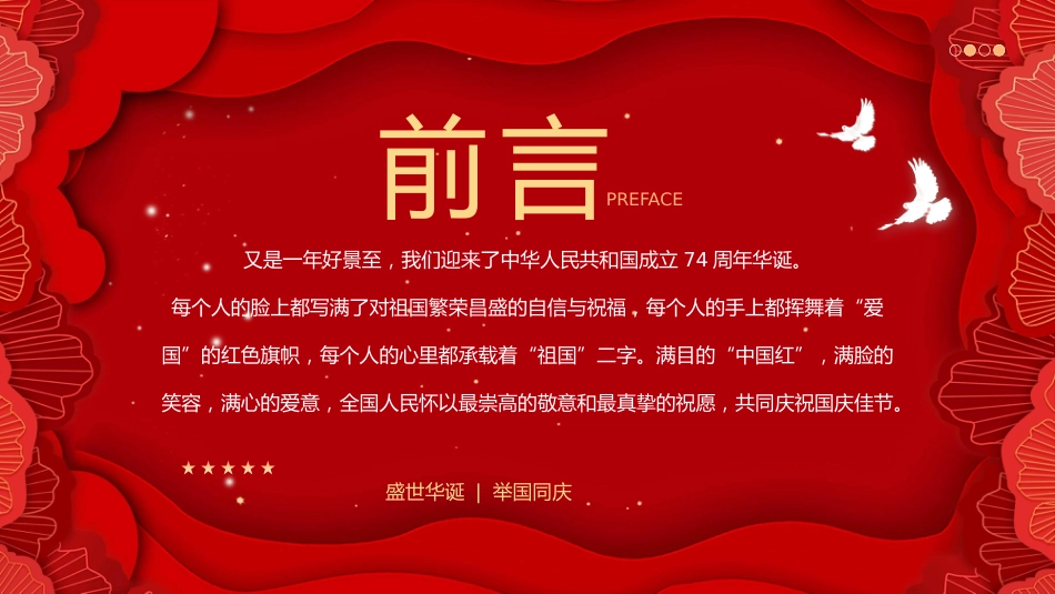 重/溫/歷/史/榮/耀展/望/未/來(lái)/輝/煌單擊此處輸入你的正文,文字是您思想的提煉,為了最終演示發(fā)布的良好效果,請(qǐng)盡量言簡(jiǎn)意賅的闡述觀點(diǎn);根據(jù)需要可酌情增減文字,以便觀者可以準(zhǔn)確理解您所傳達(dá)的信息。前言PREFACE盛世華誕|舉國(guó)同慶又是一年好景至,我們迎來(lái)了中華人民共和國(guó)成立74周年華誕。每個(gè)人的臉上都寫(xiě)滿(mǎn)了對(duì)祖國(guó)繁榮昌盛的自信與祝福,每個(gè)人的手上都揮舞著“愛(ài)國(guó)”的紅色旗幟,每個(gè)人的心里都承載著“祖國(guó)”二字。滿(mǎn)目的“中國(guó)紅”,滿(mǎn)臉的笑容,滿(mǎn)心的愛(ài)意,全國(guó)人民懷以最崇高的敬意和最真摯的祝愿,共同慶祝國(guó)慶佳節(jié)。目錄CONTENTS01020405國(guó)慶節(jié)的由來(lái)國(guó)...
