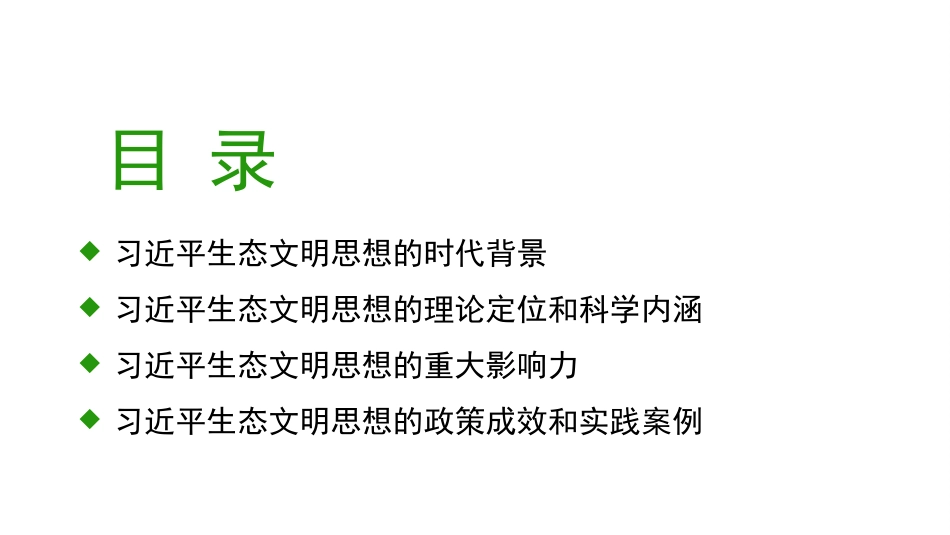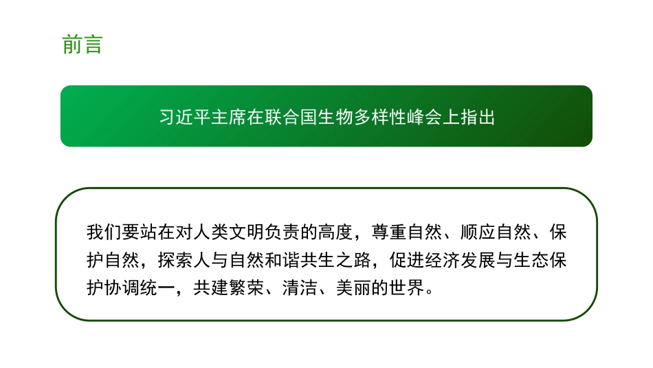 深入學習貫徹習近平生態(tài)文明思想促進可持續(xù)發(fā)展目錄?習近平生態(tài)文明思想的時代背景?習近平生態(tài)文明思想的理論定位和科學內(nèi)涵?習近平生態(tài)文明思想的重大影響力?習近平生態(tài)文明思想的政策成效和實踐案例前言習近平主席在聯(lián)合國生物多樣性峰會上指出我們要站在對人類文明負責的高度,尊重自然、順應自然、保護自然,探索人與自然和諧共生之路,促進經(jīng)濟發(fā)展與生態(tài)保護協(xié)調(diào)統(tǒng)一,共建繁榮、清潔、美麗的世界。前言以習近平同志為核心的黨中央把生態(tài)文明建設作為關系中華民族永續(xù)發(fā)展的根本大計,大力推進生態(tài)文明理論創(chuàng)新、實踐創(chuàng)新、制度創(chuàng)新,推動生態(tài)環(huán)境保護發(fā)生歷史...