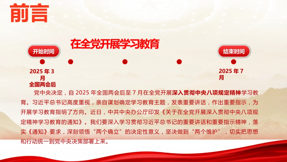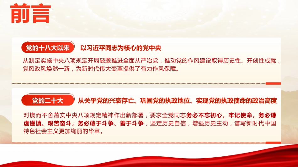 堅(jiān)持以作風(fēng)建設(shè)引領(lǐng)保障高質(zhì)量發(fā)展授課人:XXX前言前言從制定實(shí)施中央八項(xiàng)規(guī)定開(kāi)局破題推進(jìn)全面從嚴(yán)治黨,推動(dòng)黨的作風(fēng)建設(shè)取得歷史性、開(kāi)創(chuàng)性成就,黨風(fēng)政風(fēng)煥然一新,為新時(shí)代偉大變革提供了有力作風(fēng)保障。以習(xí)近平同志為核心的黨中央黨的十八大以來(lái)從關(guān)乎黨的興衰存亡、鞏固黨的執(zhí)政地位、實(shí)現(xiàn)黨的執(zhí)政使命的政治高度黨的二十大對(duì)鍥而不舍落實(shí)中央八項(xiàng)規(guī)定精神作出新部署,要求全黨同志務(wù)必不忘初心、牢記使命,務(wù)必謙虛謹(jǐn)慎、艱苦奮斗,務(wù)必敢于斗爭(zhēng)、善于斗爭(zhēng),堅(jiān)定歷史自信,增強(qiáng)歷史主動(dòng),譜寫(xiě)新時(shí)代中國(guó)特色社會(huì)主義更加絢麗的華章。前言前言黨中央決定,自2025...