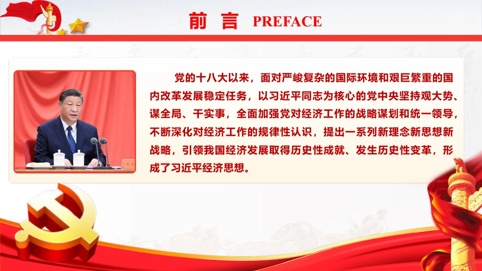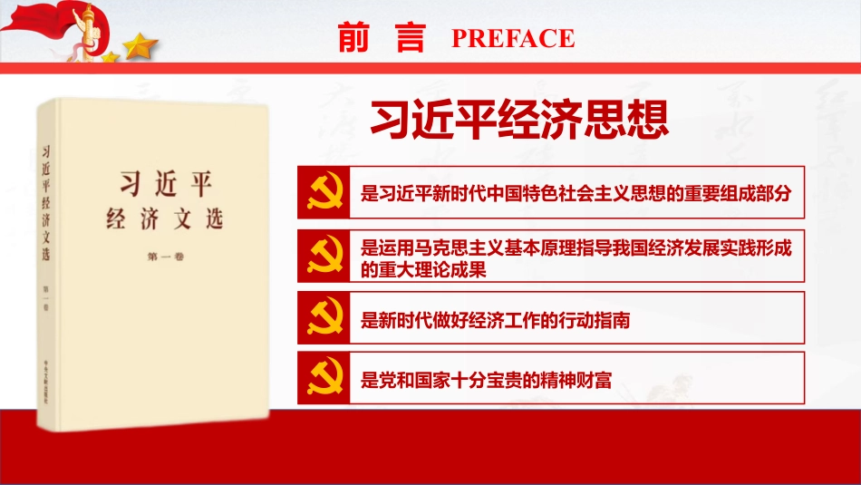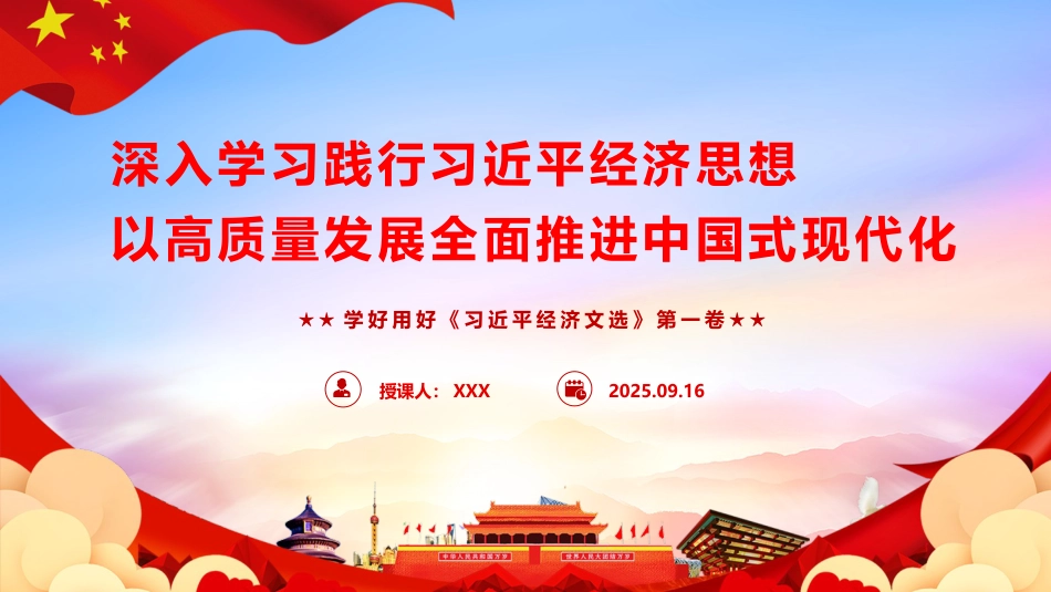 授課人:XXX2025.09.16深入學(xué)習(xí)踐行習(xí)近平經(jīng)濟思想以高質(zhì)量發(fā)展全面推進中國式現(xiàn)代化★★學(xué)好用好《習(xí)近平經(jīng)濟文選》第一卷★★前言PREFACE黨的十八大以來,面對嚴峻復(fù)雜的國際環(huán)境和艱巨繁重的國內(nèi)改革發(fā)展穩(wěn)定任務(wù),以習(xí)近平同志為核心的黨中央堅持觀大勢、謀全局、干實事,全面加強黨對經(jīng)濟工作的戰(zhàn)略謀劃和統(tǒng)一領(lǐng)導(dǎo),不斷深化對經(jīng)濟工作的規(guī)律性認識,提出一系列新理念新思想新戰(zhàn)略,引領(lǐng)我國經(jīng)濟發(fā)展取得歷史性成就、發(fā)生歷史性變革,形成了習(xí)近平經(jīng)濟思想。前言PREFACE習(xí)近平經(jīng)濟思想是運用馬克思主義基本原理指導(dǎo)我國經(jīng)濟發(fā)展實踐形成的重大理論成果是習(xí)近平新時...