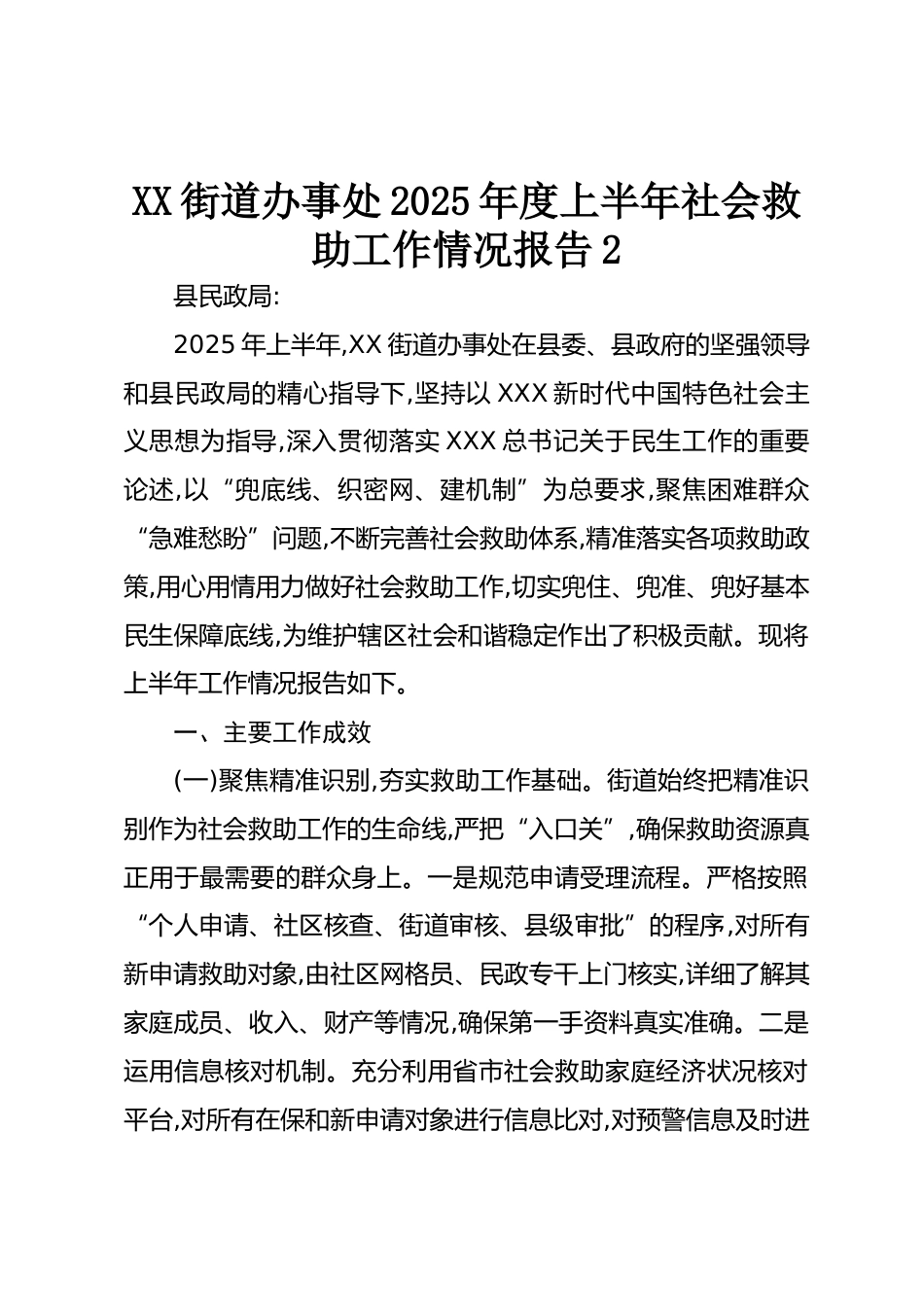 XX街道辦事處2025年度上半年社會救助工作情況報告2縣民政局:2025年上半年,XX街道辦事處在縣委、縣政府的堅強領(lǐng)導(dǎo)和縣民政局的精心指導(dǎo)下,堅持以XXX新時代中國特色社會主義思想為指導(dǎo),深入貫徹落實XXX總書記關(guān)于民生工作的重要論述,以“兜底線、織密網(wǎng)、建機制”為總要求,聚焦困難群眾“急難愁盼”問題,不斷完善社會救助體系,精準落實各項救助政策,用心用情用力做好社會救助工作,切實兜住、兜準、兜好基本民生保障底線,為維護轄區(qū)社會和諧穩(wěn)定作出了積極貢獻?,F(xiàn)將上半年工作情況報告如下。一、主要工作成效(一)聚焦精準識別,夯實救助工作基礎(chǔ)。街道始終把精準識別作為社...