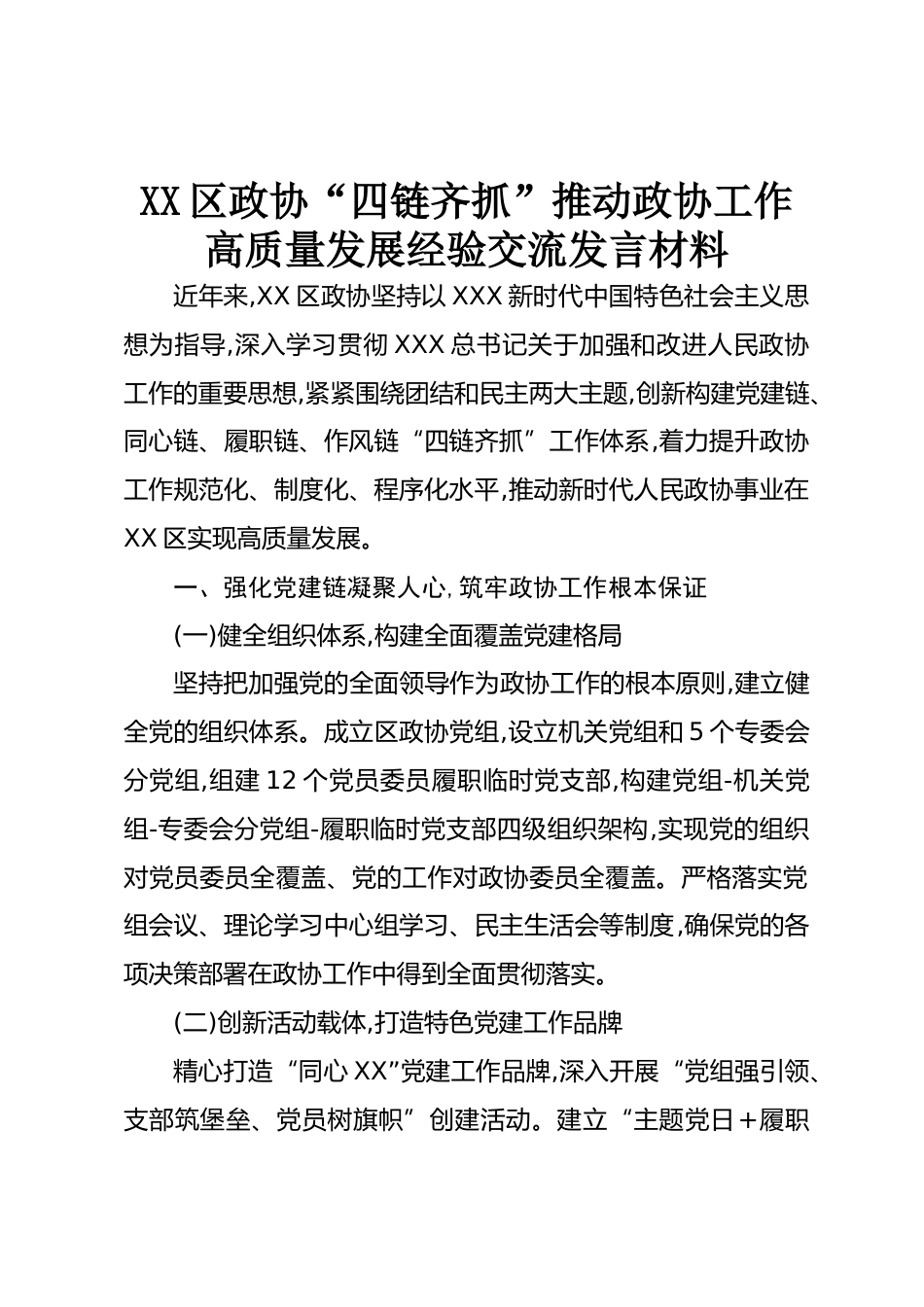 XX區(qū)政協(xié)“四鏈齊抓”推動(dòng)政協(xié)工作高質(zhì)量發(fā)展經(jīng)驗(yàn)交流發(fā)言材料