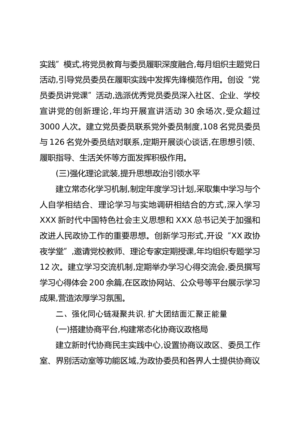 XX區(qū)政協(xié)“四鏈齊抓”推動(dòng)政協(xié)工作高質(zhì)量發(fā)展經(jīng)驗(yàn)交流發(fā)言材料近年來,XX區(qū)政協(xié)堅(jiān)持以XXX新時(shí)代中國特色社會(huì)主義思想為指導(dǎo),深入學(xué)習(xí)貫徹XXX總書記關(guān)于加強(qiáng)和改進(jìn)人民政協(xié)工作的重要思想,緊緊圍繞團(tuán)結(jié)和民主兩大主題,創(chuàng)新構(gòu)建黨建鏈、同心鏈、履職鏈、作風(fēng)鏈“四鏈齊抓”工作體系,著力提升政協(xié)工作規(guī)范化、制度化、程序化水平,推動(dòng)新時(shí)代人民政協(xié)事業(yè)在XX區(qū)實(shí)現(xiàn)高質(zhì)量發(fā)展。一、強(qiáng)化黨建鏈凝聚人心,筑牢政協(xié)工作根本保證(一)健全組織體系,構(gòu)建全面覆蓋黨建格局堅(jiān)持把加強(qiáng)黨的全面領(lǐng)導(dǎo)作為政協(xié)工作的根本原則,建立健全黨的組織體系。成立區(qū)政協(xié)黨組,設(shè)立機(jī)關(guān)黨組和5個(gè)專委...