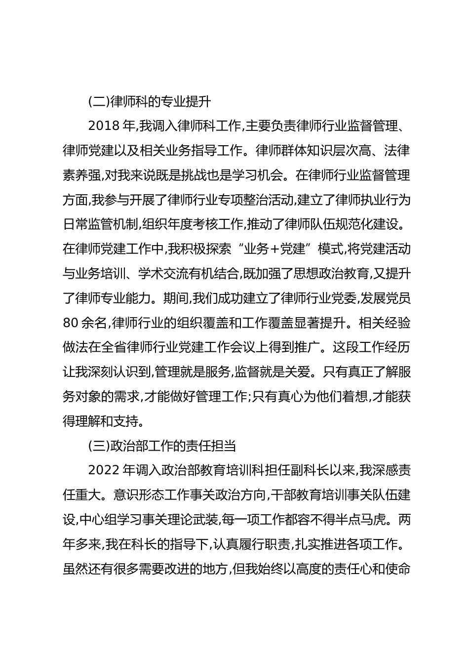XX市司法局副科長向新任局長的匯報材料(精品)X局長,您好!感謝您在百忙之中抽出時間聽取我的工作匯報。我是政治部教育培訓(xùn)科副科長XX,今天想向您匯報我的工作經(jīng)歷、現(xiàn)在負(fù)責(zé)的主要業(yè)務(wù)以及對今后工作的一些思考,懇請您批評指正。一、個人工作履歷和主要收獲(一)行政審批科的基礎(chǔ)歷練我于2015年進(jìn)入XX市司法局,首先在行政審批科工作了近4年時間。這個崗位讓我深刻理解了什么叫“為人民服務(wù)”。當(dāng)時正值“放管服”改革深入推進(jìn),我主要負(fù)責(zé)律師事務(wù)所、公證處、司法鑒定機構(gòu)等法律服務(wù)機構(gòu)的設(shè)立審批工作。在這個崗位上,我累計辦理各類審批事項800余件,辦結(jié)率100%,群眾滿意...