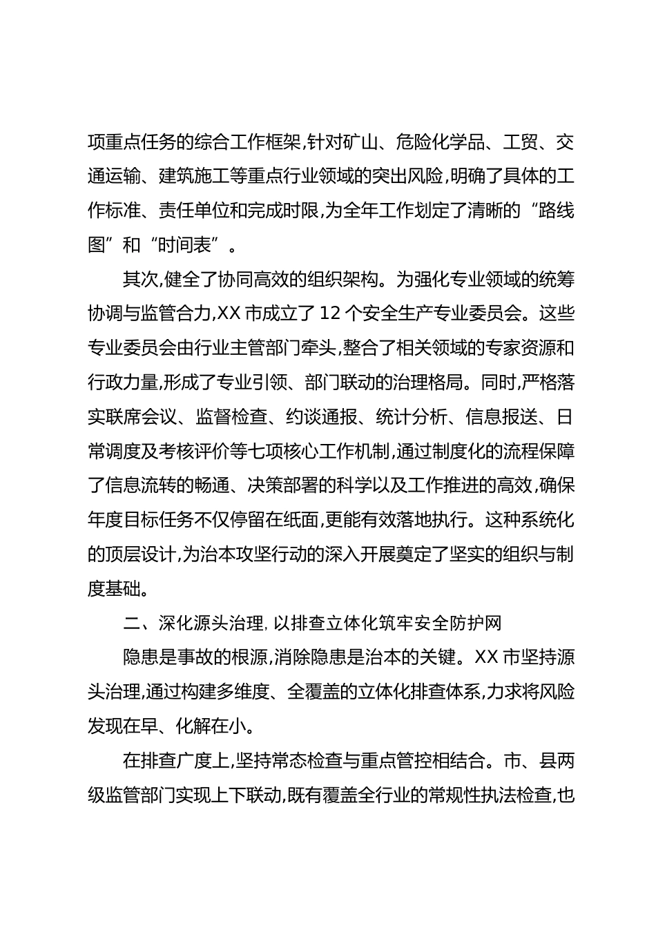 XX市應急管理局關于2025年度安全生產(chǎn)治本攻堅行動推進情況的報告(精品)進入2025年以來,為貫徹落實國家及XX省關于安全生產(chǎn)的重大決策部署,XX市以安全生產(chǎn)治本攻堅三年行動為總抓手,聚焦深層次、根源性問題,構建并實施了以“清單化、立體化、閉環(huán)化、法治化、多元化”為核心的“五化措施”工作體系。此舉旨在從根本上消除事故隱患,從根本上解決問題,強力推動全市安全生產(chǎn)治理模式向事前預防轉型。截至2025年9月12日,該行動已取得階段性顯著成效,為全市經(jīng)濟社會高質量發(fā)展提供了堅實的安全保障。本報告將對該行動的推進情況、主要做法及成效進行系統(tǒng)性闡述。一、強化頂層...