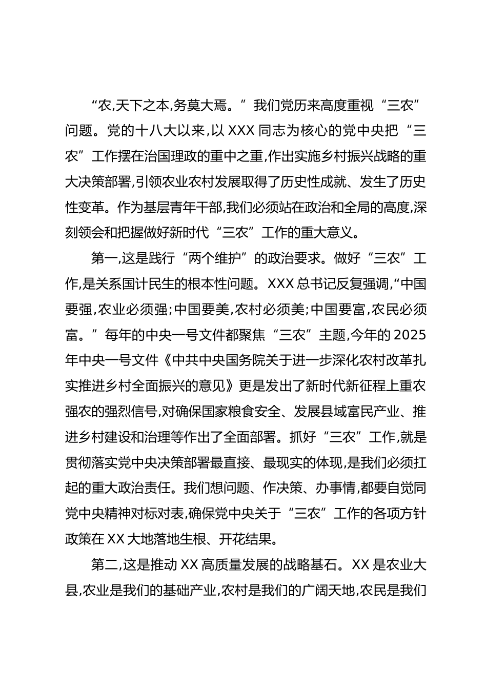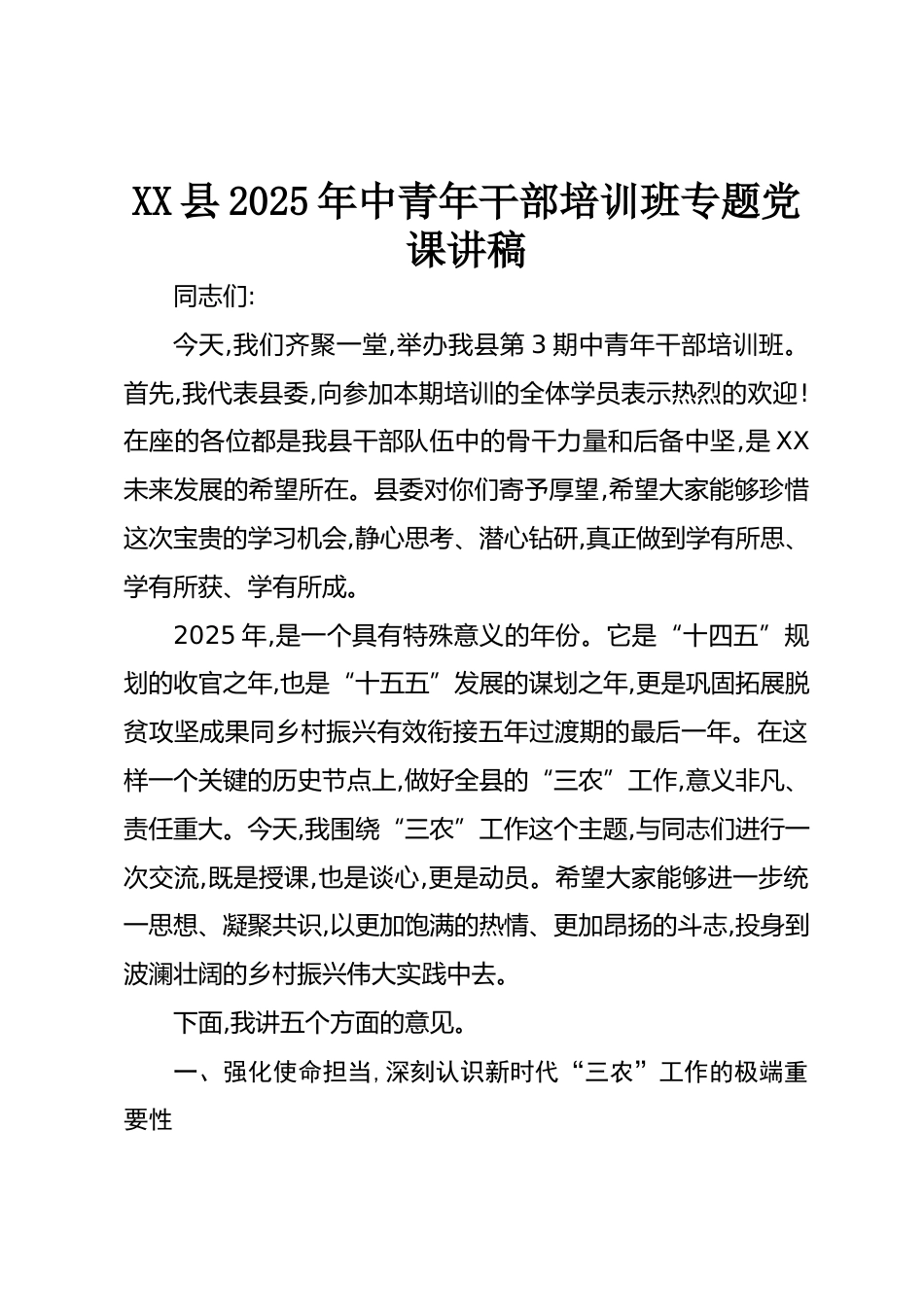 XX縣2025年中青年干部培訓(xùn)班專題黨課講稿同志們:今天,我們齊聚一堂,舉辦我縣第3期中青年干部培訓(xùn)班。首先,我代表縣委,向參加本期培訓(xùn)的全體學(xué)員表示熱烈的歡迎!在座的各位都是我縣干部隊(duì)伍中的骨干力量和后備中堅(jiān),是XX未來發(fā)展的希望所在。縣委對(duì)你們寄予厚望,希望大家能夠珍惜這次寶貴的學(xué)習(xí)機(jī)會(huì),靜心思考、潛心鉆研,真正做到學(xué)有所思、學(xué)有所獲、學(xué)有所成。2025年,是一個(gè)具有特殊意義的年份。它是“十四五”規(guī)劃的收官之年,也是“十五五”發(fā)展的謀劃之年,更是鞏固拓展脫貧攻堅(jiān)成果同鄉(xiāng)村振興有效銜接五年過渡期的最后一年。在這樣一個(gè)關(guān)鍵的歷史節(jié)點(diǎn)上,做好全縣的“三...