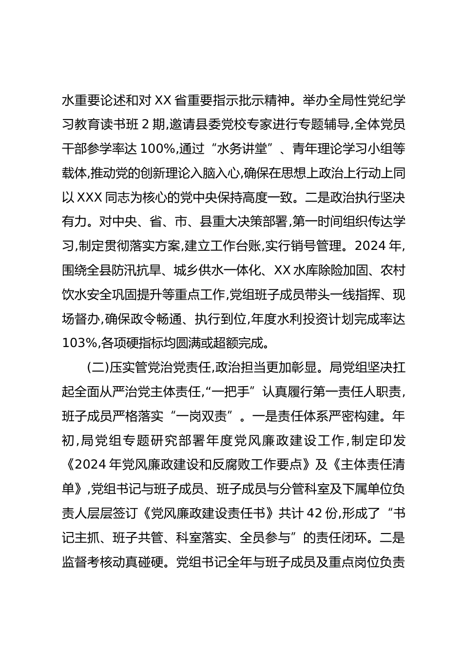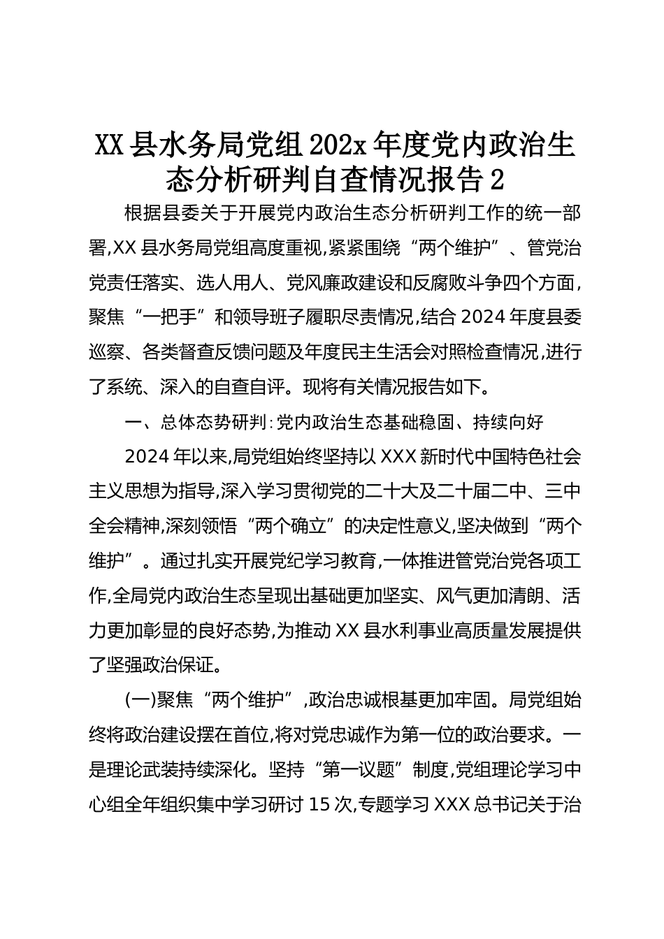 XX縣水務局黨組202x年度黨內(nèi)政治生態(tài)分析研判自查情況報告2根據(jù)縣委關(guān)于開展黨內(nèi)政治生態(tài)分析研判工作的統(tǒng)一部署,XX縣水務局黨組高度重視,緊緊圍繞“兩個維護”、管黨治黨責任落實、選人用人、黨風廉政建設和反腐敗斗爭四個方面,聚焦“一把手”和領導班子履職盡責情況,結(jié)合2024年度縣委巡察、各類督查反饋問題及年度民主生活會對照檢查情況,進行了系統(tǒng)、深入的自查自評?,F(xiàn)將有關(guān)情況報告如下。一、總體態(tài)勢研判:黨內(nèi)政治生態(tài)基礎穩(wěn)固、持續(xù)向好2024年以來,局黨組始終堅持以XXX新時代中國特色社會主義思想為指導,深入學習貫徹黨的二十大及二十屆二中、三中全會精神,深刻...