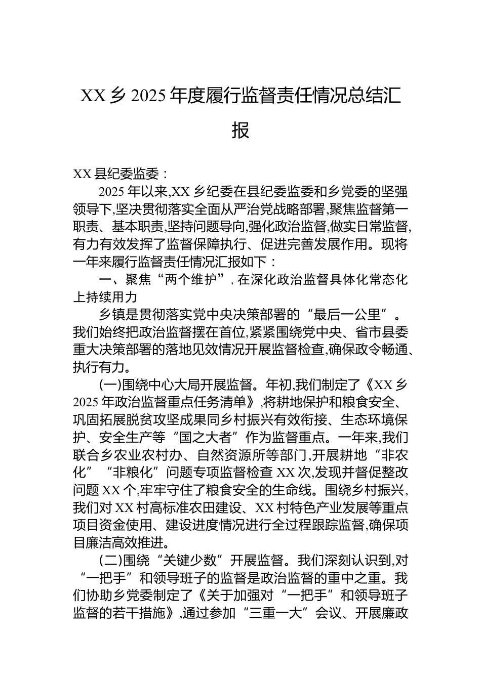 XX鄉(xiāng)2025年度履行監(jiān)督責(zé)任情況總結(jié)匯報(bào)