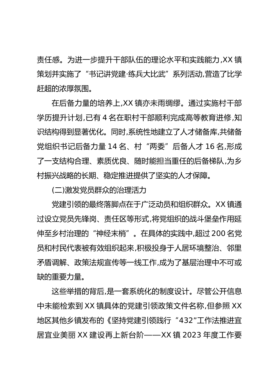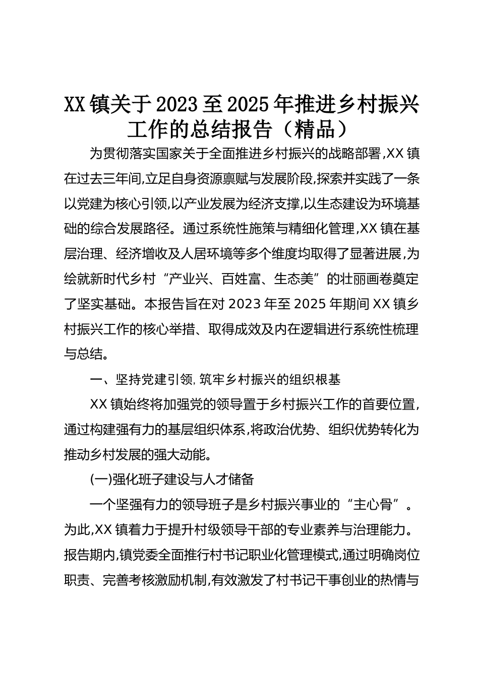 XX鎮(zhèn)關(guān)于2023至2025年推進(jìn)鄉(xiāng)村振興工作的總結(jié)報(bào)告(精品)為貫徹落實(shí)國家關(guān)于全面推進(jìn)鄉(xiāng)村振興的戰(zhàn)略部署,XX鎮(zhèn)在過去三年間,立足自身資源稟賦與發(fā)展階段,探索并實(shí)踐了一條以黨建為核心引領(lǐng),以產(chǎn)業(yè)發(fā)展為經(jīng)濟(jì)支撐,以生態(tài)建設(shè)為環(huán)境基礎(chǔ)的綜合發(fā)展路徑。通過系統(tǒng)性施策與精細(xì)化管理,XX鎮(zhèn)在基層治理、經(jīng)濟(jì)增收及人居環(huán)境等多個(gè)維度均取得了顯著進(jìn)展,為繪就新時(shí)代鄉(xiāng)村“產(chǎn)業(yè)興、百姓富、生態(tài)美”的壯麗畫卷奠定了堅(jiān)實(shí)基礎(chǔ)。本報(bào)告旨在對2023年至2025年期間XX鎮(zhèn)鄉(xiāng)村振興工作的核心舉措、取得成效及內(nèi)在邏輯進(jìn)行系統(tǒng)性梳理與總結(jié)。一、堅(jiān)持黨建引領(lǐng),筑牢鄉(xiāng)村振興的組織根基XX鎮(zhèn)...