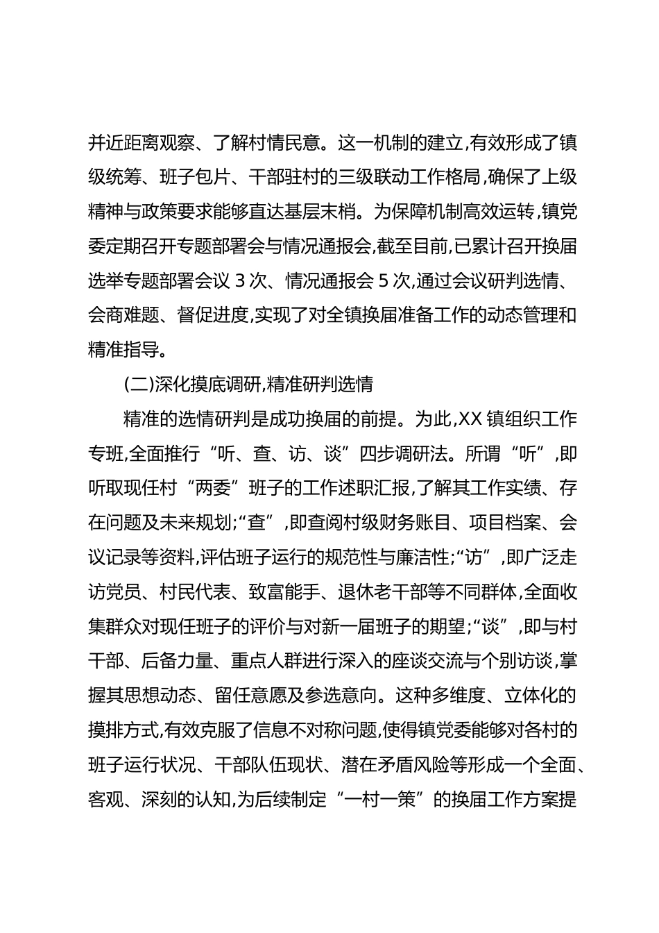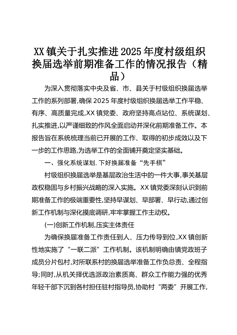 XX鎮(zhèn)關(guān)于扎實推進(jìn)2025年度村級組織換屆選舉前期準(zhǔn)備工作的情況報告(精品)為深入貫徹落實中央及省、市、縣關(guān)于村級組織換屆選舉工作的系列部署,確保2025年度村級組織換屆選舉工作平穩(wěn)、有序、高質(zhì)量完成,XX鎮(zhèn)黨委、政府堅持高點站位、系統(tǒng)謀劃、扎實推進(jìn),以嚴(yán)謹(jǐn)細(xì)致的作風(fēng)全面啟動并深化前期準(zhǔn)備工作。本報告旨在系統(tǒng)梳理當(dāng)前已開展的工作、取得的初步成效以及下一步的工作思路,為選舉工作的全面鋪開奠定堅實基礎(chǔ)。一、強化系統(tǒng)謀劃,下好換屆準(zhǔn)備“先手棋”村級組織換屆選舉是基層政治生活中的一件大事,事關(guān)基層政權(quán)穩(wěn)固與鄉(xiāng)村振興戰(zhàn)略的深入實施。XX鎮(zhèn)黨委深刻認(rèn)識到前...