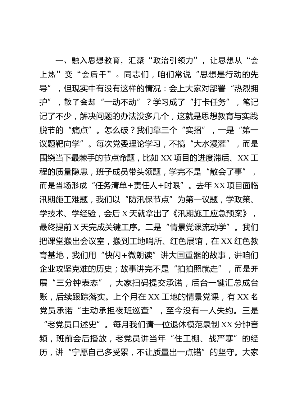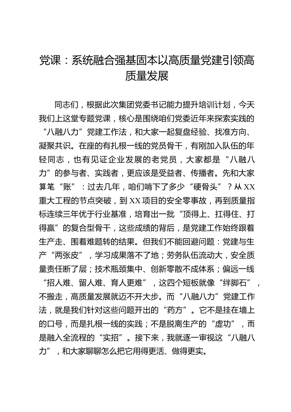 黨課:系統(tǒng)融合強基固本以高質(zhì)量黨建引領(lǐng)高質(zhì)量發(fā)展同志們,根據(jù)此次集團黨委書記能力提升培訓(xùn)計劃,今天我們上這堂專題黨課,核心是圍繞咱們黨委近年來探索實踐的“八融八力”黨建工作法,和大家一起復(fù)盤經(jīng)驗、找準(zhǔn)方向、凝聚共識。在座的有扎根一線的黨員骨干,有剛加入隊伍的年輕同志,也有見證企業(yè)發(fā)展的老黨員,大家都是“八融八力”的參與者、實踐者,更應(yīng)該是受益者、傳播者。先和大家算筆“賬”:過去幾年,咱們啃下了多少“硬骨頭”?從XX重大工程的節(jié)點突破,到XX項目的安全零事故,再到質(zhì)量指標(biāo)連續(xù)三年優(yōu)于行業(yè)基準(zhǔn),培育出一批“頂?shù)蒙稀⒖傅米?、打得贏”的...